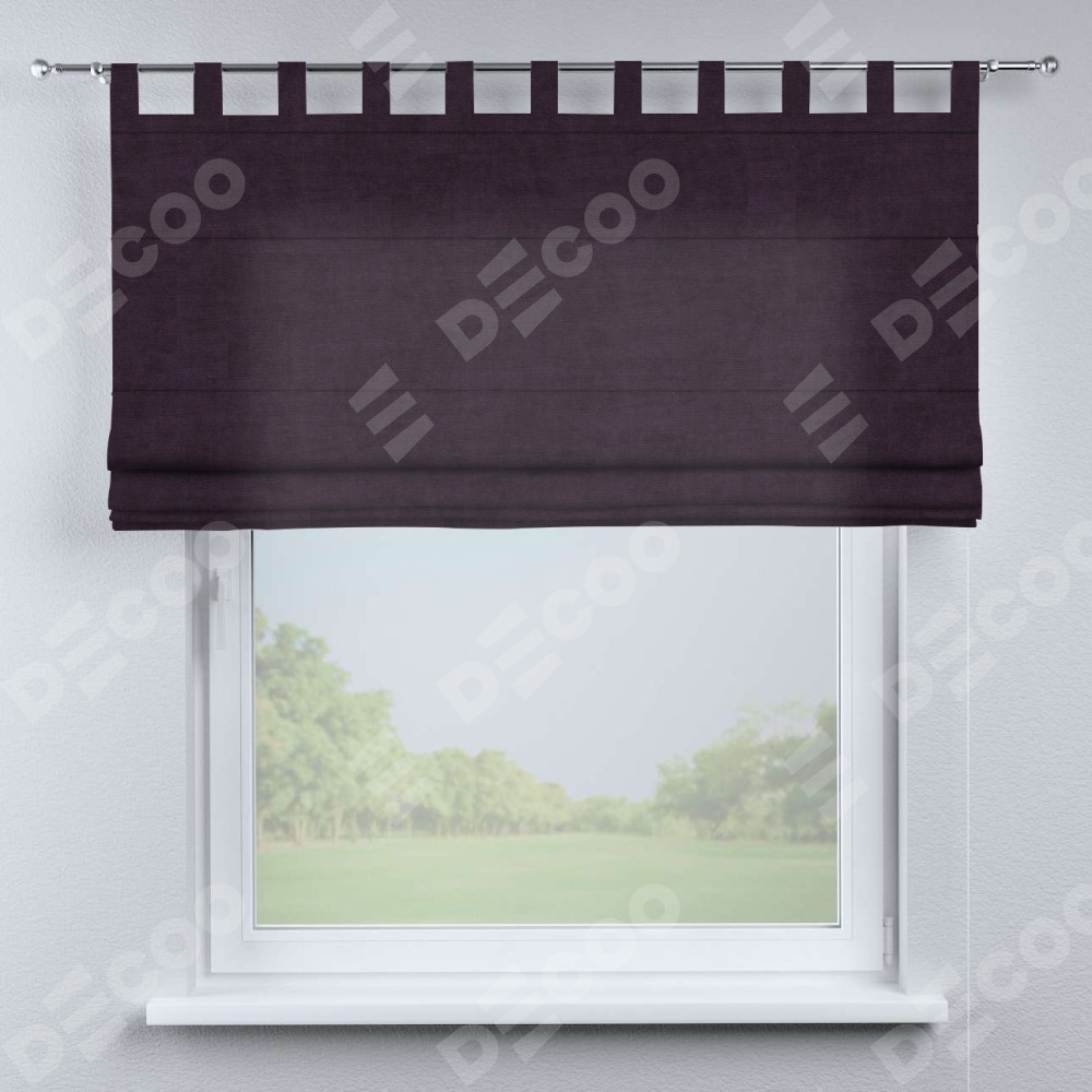 Римская штора производителя «Cortin», используется для проёма, пошита из ткани вельвет тёмно-фиолетовый, артикул ткани 72403. Данная модель пошита на петлях, комплектуется на выбор круглым карнизом и подходит для монтажа на стену. Римская штора на петлях имеет простую систему регулировки высоты, отличительным преимуществом данной модели является простой способ монтажа. Достаточно повесить ее на трубу и штора готова!