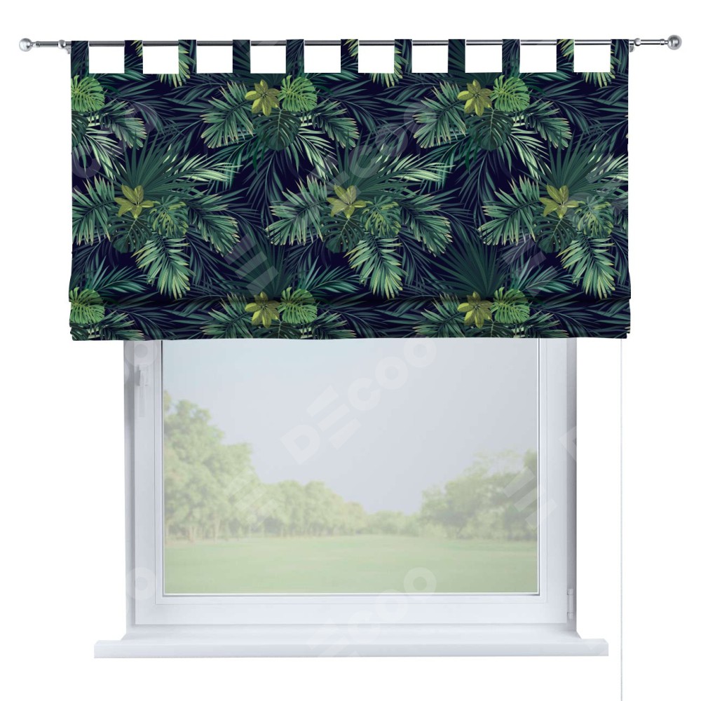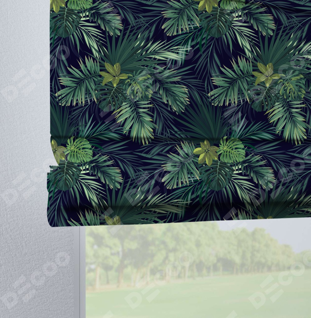 Римская штора производителя «Cortin», используется для проёма, пошита из ткани блэкаут с нанесением сублимационной печати «Пальмовые листья». Данная модель пошита на петлях, комплектуется на выбор круглым карнизом и подходит для монтажа на стену. Римская штора на петлях имеет простую систему регулировки высоты, отличительным преимуществом данной модели является простой способ монтажа. Достаточно повесить ее на трубу и штора готова!
