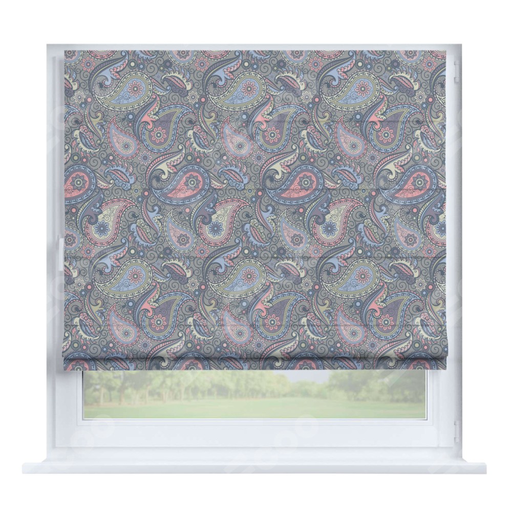 Римская штора производителя «Cortin», устанавливается на створку окна, пошита из ткани блэкаут с нанесением сублимационной печати «Цветной пейсли». Штора шьётся по индивидуальным размерам, для данного типа римской шторы возможная ширина от 35 до 150 см., высота до 250 см.