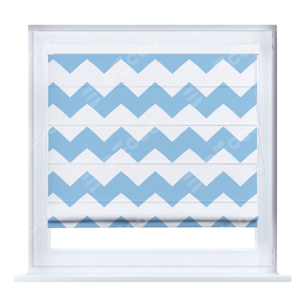 Римская штора кассетного типа, производителя «Cortin», устанавливается только на пластиковые окна и прилегает к стеклопакету, пошита из ткани блэкаут с нанесением сублимационной печати «Зигзаг крупный».