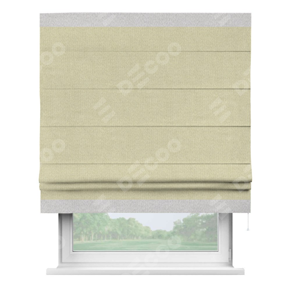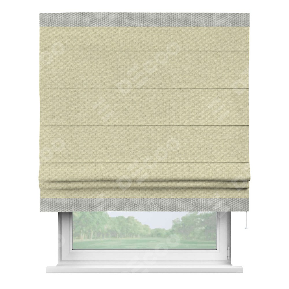Римская штора производителя «Cortin», используется для проёма, пошита из ткани лён димаут шампань, артикул 90994. Отделка шторы кантом «Горизонт», ткань для канта используется из льна димаут разной расцветки на выбор. Имеет универсальный механизм и подходит для монтажа: на потолок, на стену и в нишу.