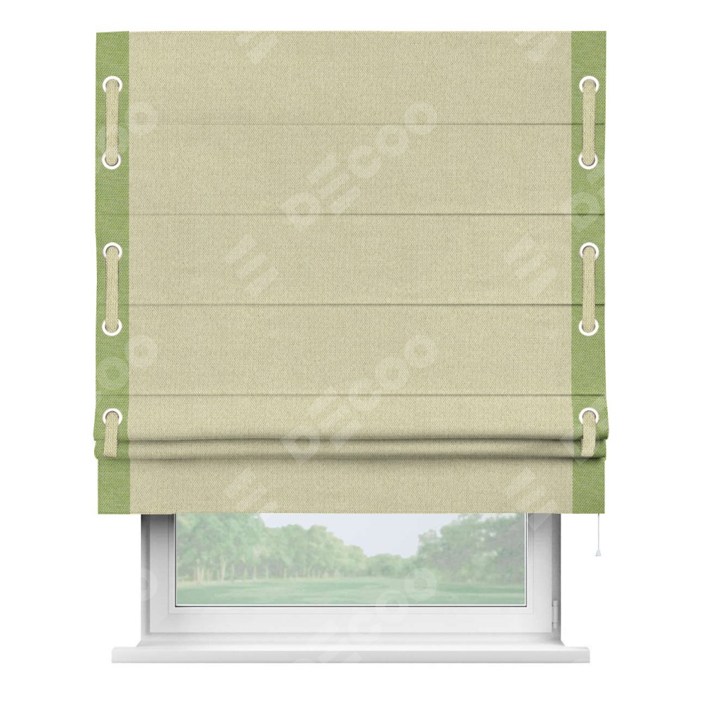 Римская штора производителя «Cortin», используется для проёма, пошита из ткани лён димаут шампань, артикул 90994. Отделка шторы кантом «Стрим Дуо» на кантах расположены люверсы с пояском, ткань для канта используется лён димаут разной расцветки на выбор. Ткань для пояска обычно используется из основной ткани шторы, а так же можно сделать из любой расцветки по желанию. Имеет универсальный механизм и подходит для монтажа: на потолок, на стену и в нишу.