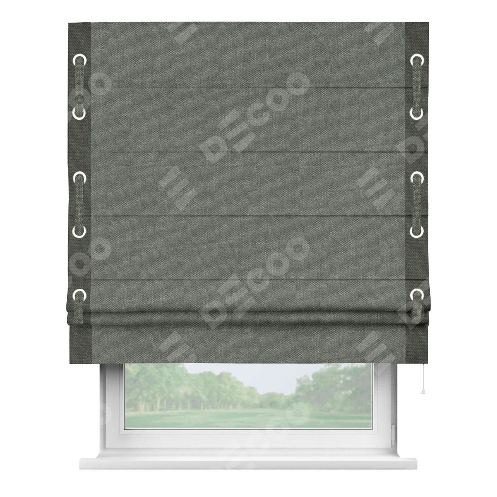 Римская штора производителя «Cortin», используется для проёма, пошита из ткани лён димаут тёмно-серый, артикул 91011. Отделка шторы кантом «Стрим Дуо» на кантах расположены люверсы с пояском, ткань для канта используется лён димаут разной расцветки на выбор. Ткань для пояска обычно используется из основной ткани шторы, а так же можно сделать из любой расцветки по желанию. Имеет универсальный механизм и подходит для монтажа: на потолок, на стену и в нишу.