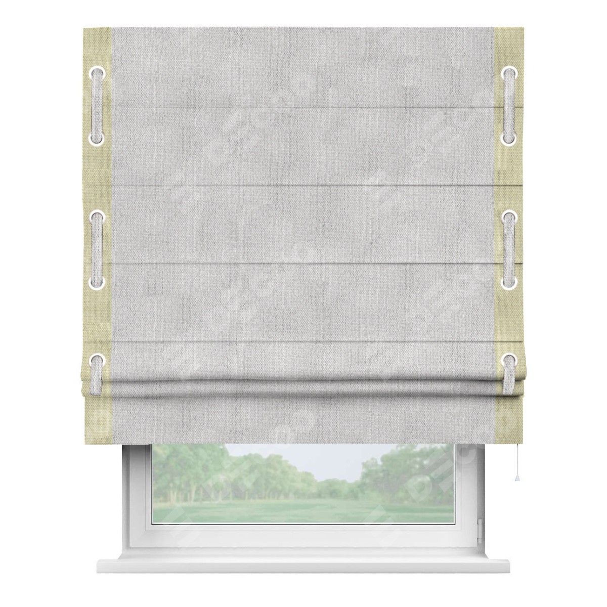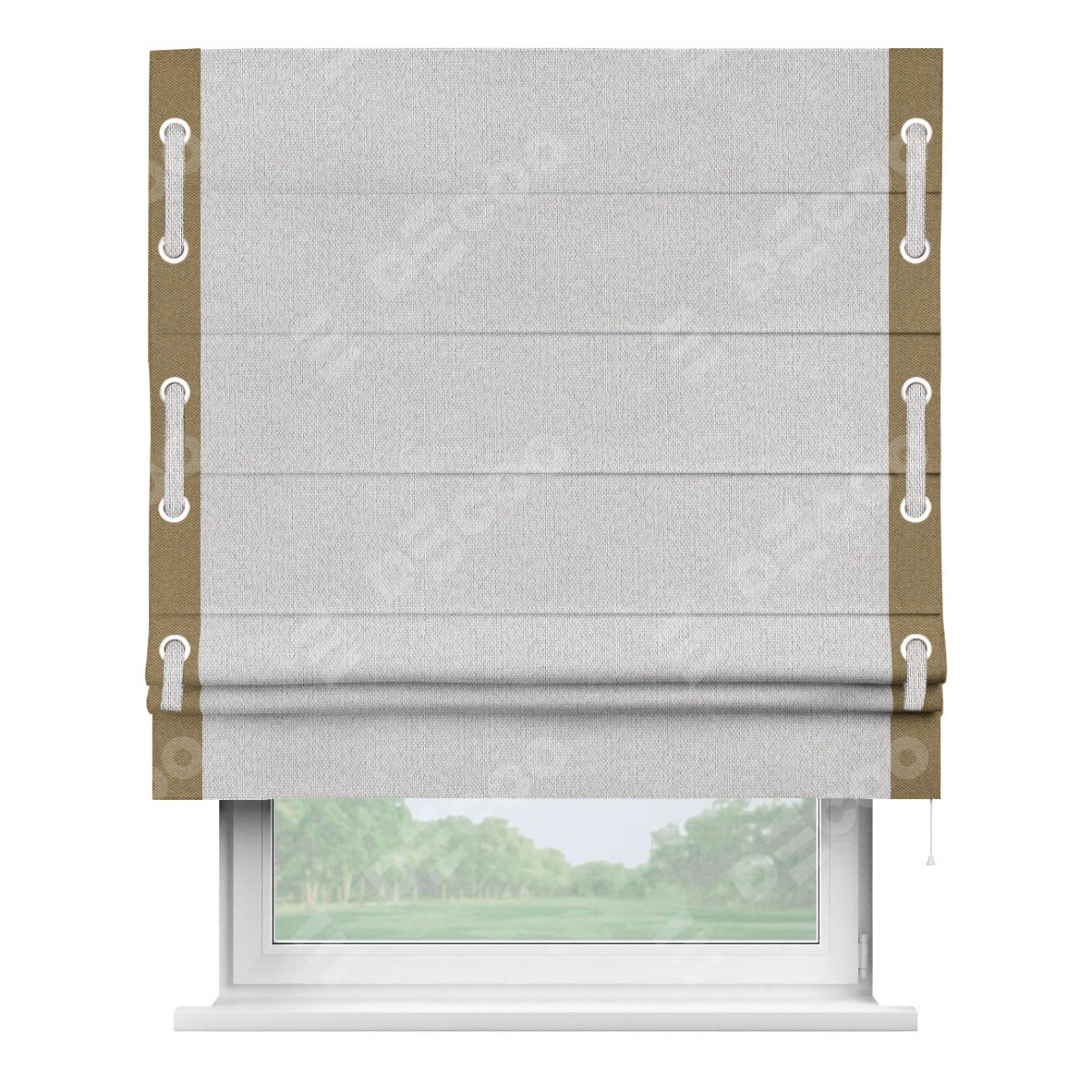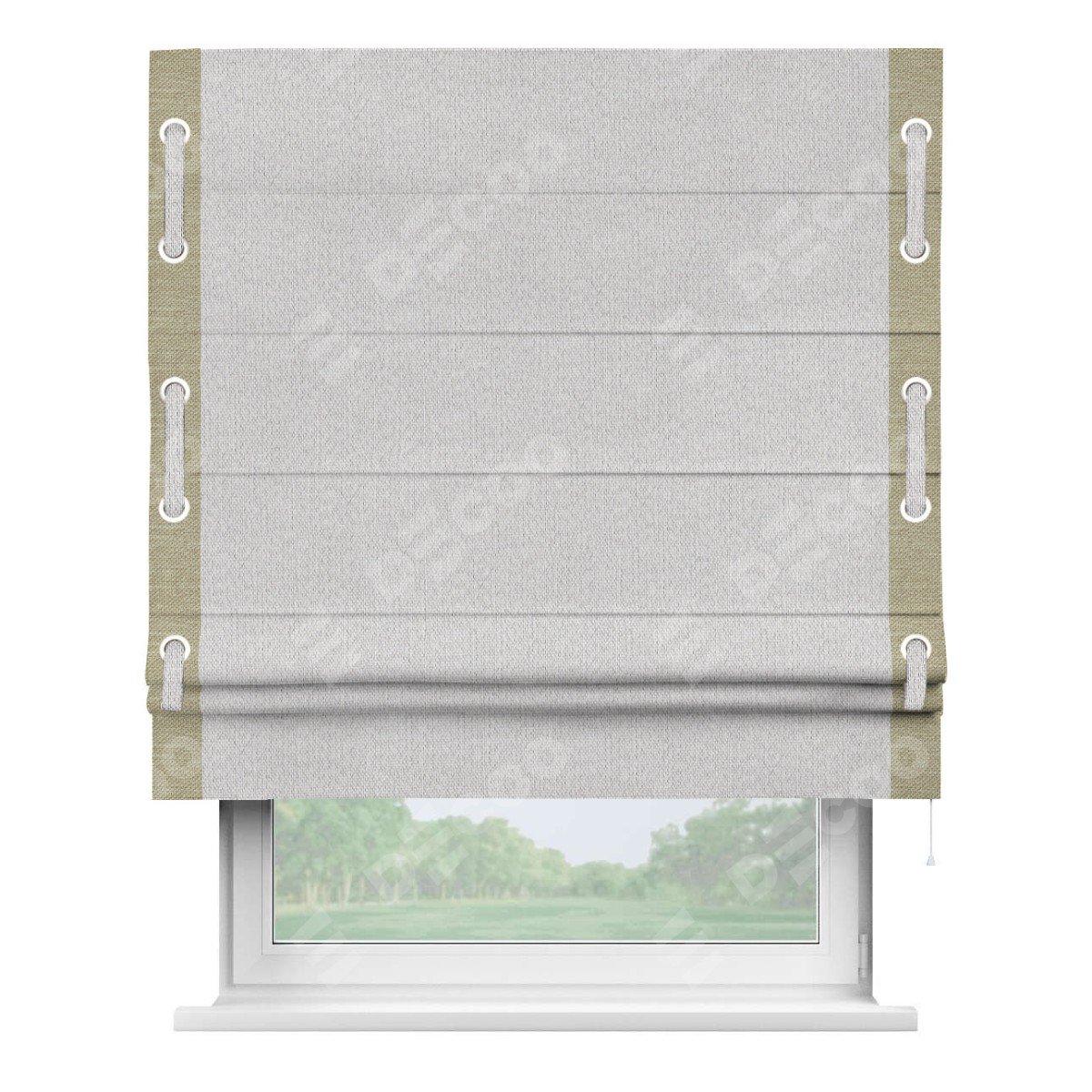 Римская штора производителя «Cortin», используется для проёма, пошита из ткани лён димаут светло-бежевый, артикул 90993. Отделка шторы кантом «Стрим Дуо» на кантах расположены люверсы с пояском, ткань для канта используется лён димаут разной расцветки на выбор. Ткань для пояска обычно используется из основной ткани шторы, а так же можно сделать из любой расцветки по желанию. Имеет универсальный механизм и подходит для монтажа: на потолок, на стену и в нишу.
