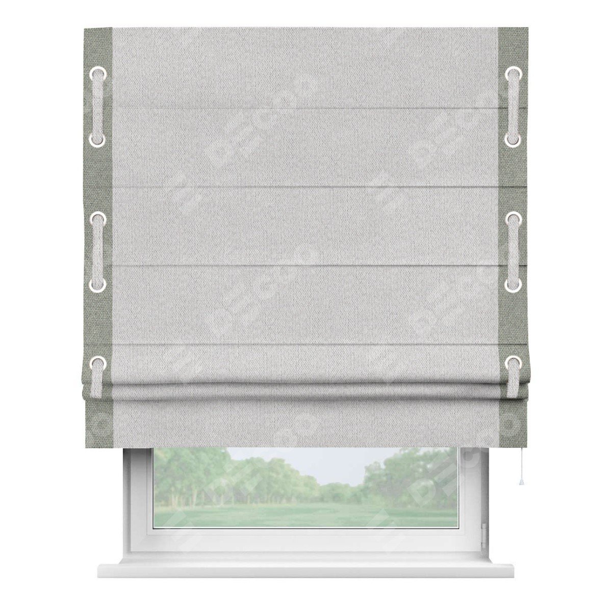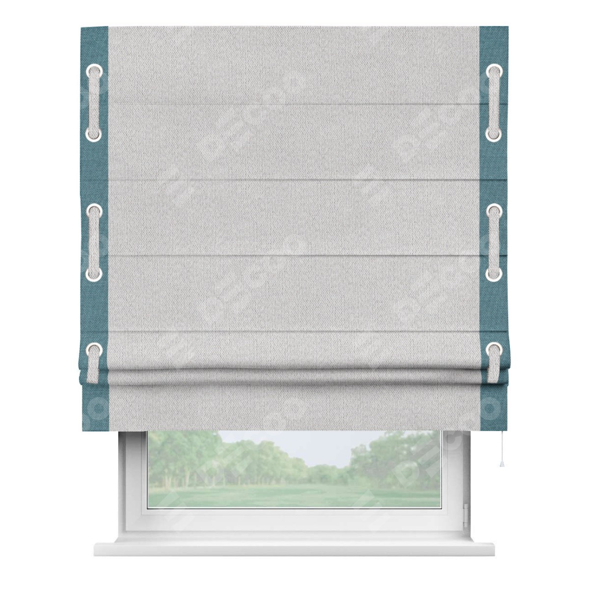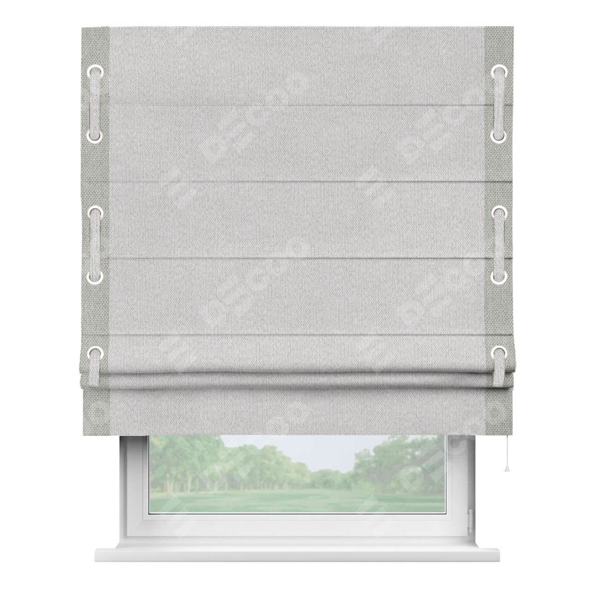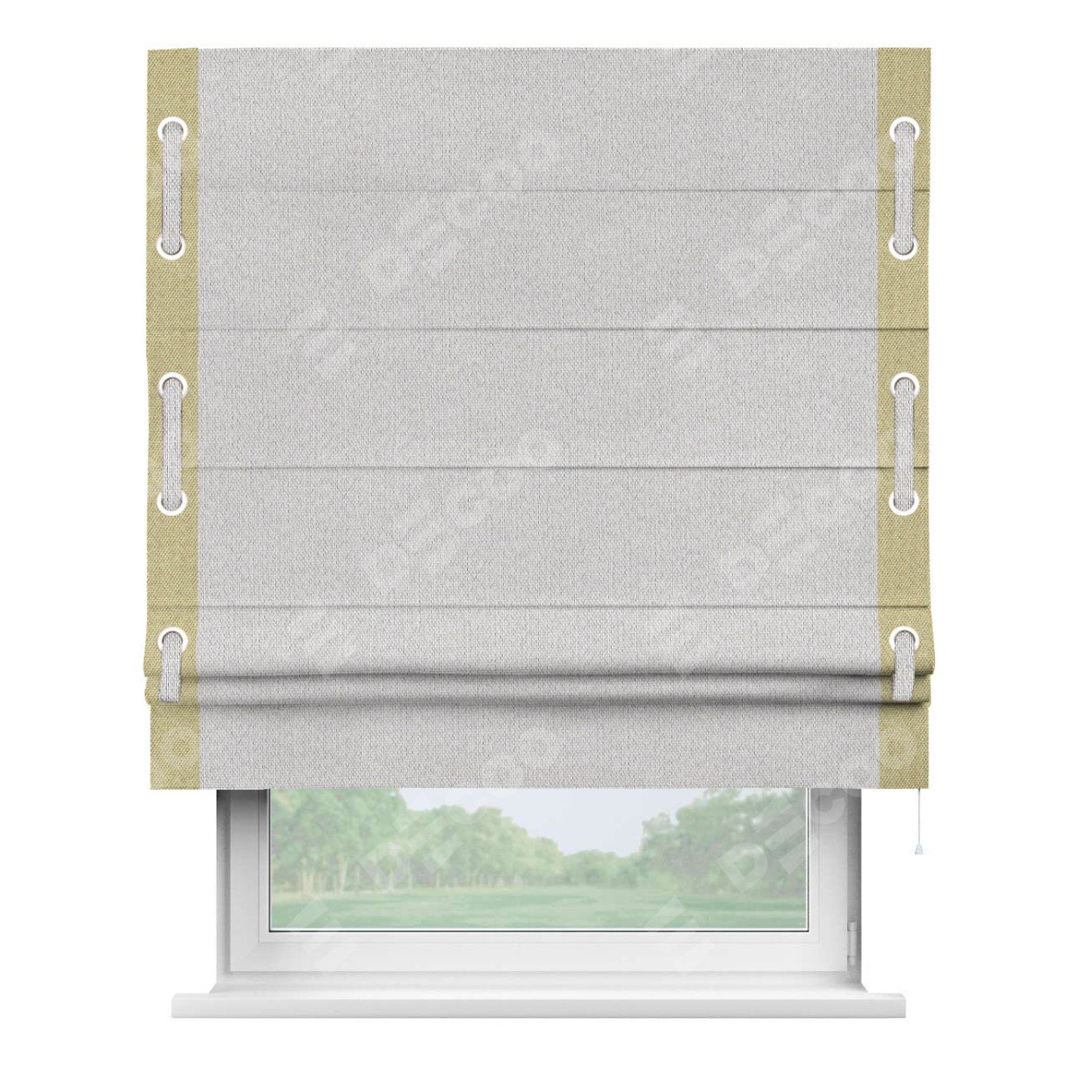 Римская штора производителя «Cortin», используется для проёма, пошита из ткани лён димаут светло-бежевый, артикул 90993. Отделка шторы кантом «Стрим Дуо» на кантах расположены люверсы с пояском, ткань для канта используется лён димаут разной расцветки на выбор. Ткань для пояска обычно используется из основной ткани шторы, а так же можно сделать из любой расцветки по желанию. Имеет универсальный механизм и подходит для монтажа: на потолок, на стену и в нишу.