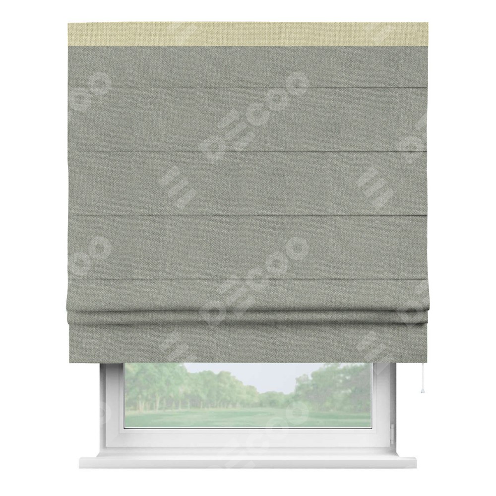 Римская штора производителя «Cortin», используется для проёма, пошита из ткани лён димаут серый, артикул 91009. Отделка шторы кантом «Кинг», ткань для канта используется из льна димаут разной расцветки на выбор. Имеет универсальный механизм и подходит для монтажа: на потолок, на стену и в нишу.