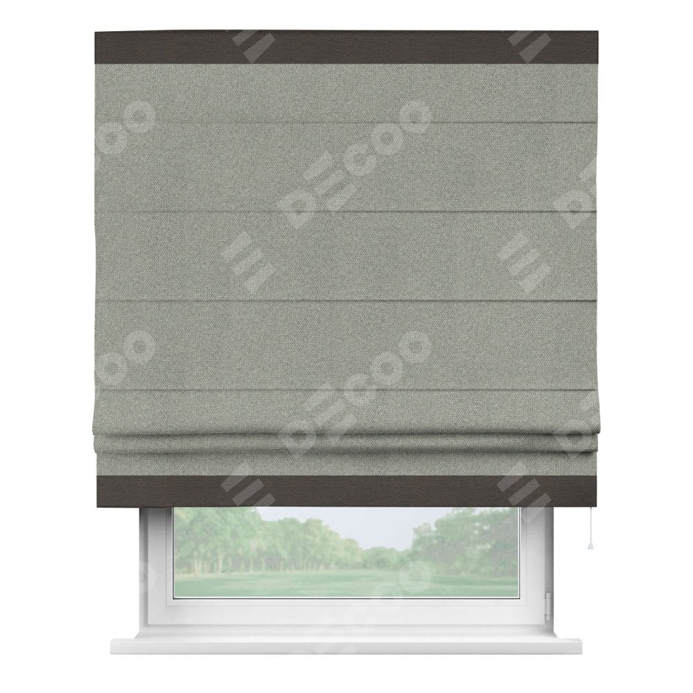 Римская штора производителя «Cortin», используется для проёма, пошита из ткани лён димаут серый, артикул 91009. Отделка шторы кантом «Горизонт», ткань для канта используется из льна димаут разной расцветки на выбор. Имеет универсальный механизм и подходит для монтажа: на потолок, на стену и в нишу.