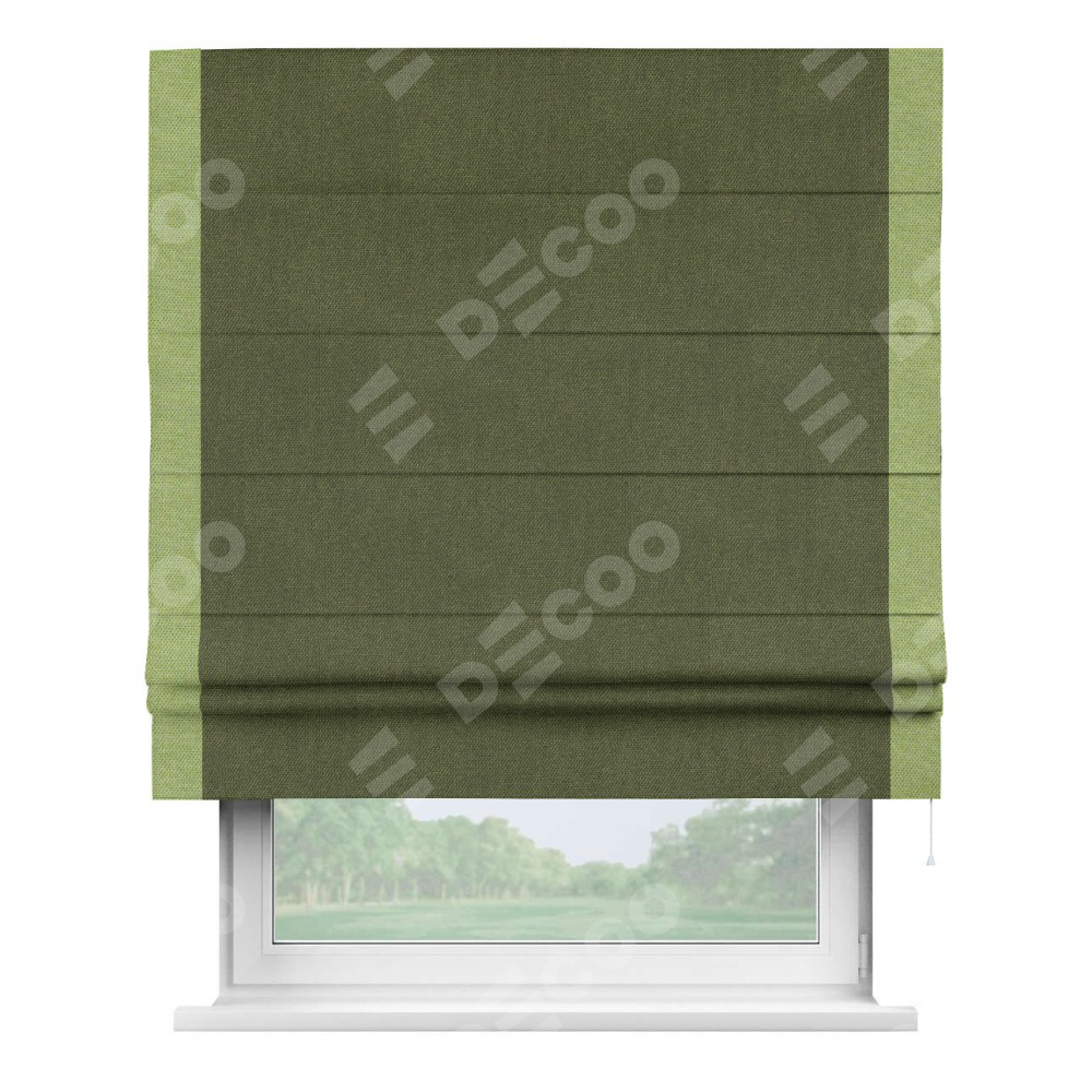 Римская штора производителя «Cortin», используется для проёма, пошита из ткани лён димаут салатовый, артикул 91002. Отделка шторы кантом «Стрим Дуо», ткань для канта используется из льна димаут разной расцветки на выбор. Имеет универсальный механизм и подходит для монтажа: на потолок, на стену и в нишу.