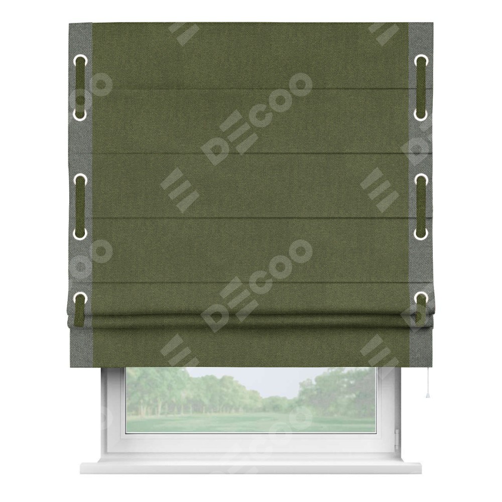Римская штора производителя «Cortin», используется для проёма, пошита из ткани лён димаут салатовый, артикул 91002. Отделка шторы кантом «Стрим Дуо» на кантах расположены люверсы с пояском, ткань для канта используется лён димаут разной расцветки на выбор. Ткань для пояска обычно используется из основной ткани шторы, а так же можно сделать из любой расцветки по желанию. Имеет универсальный механизм и подходит для монтажа: на потолок, на стену и в нишу.