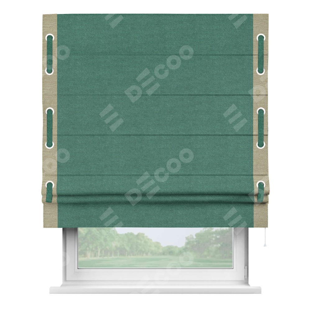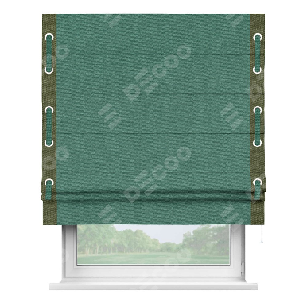 Римская штора производителя «Cortin», используется для проёма, пошита из ткани лён димаут светло-бирюзовый, артикул 91005. Отделка шторы кантом «Стрим Дуо» на кантах расположены люверсы с пояском, ткань для канта используется лён димаут разной расцветки на выбор. Ткань для пояска обычно используется из основной ткани шторы, а так же можно сделать из любой расцветки по желанию. Имеет универсальный механизм и подходит для монтажа: на потолок, на стену и в нишу.