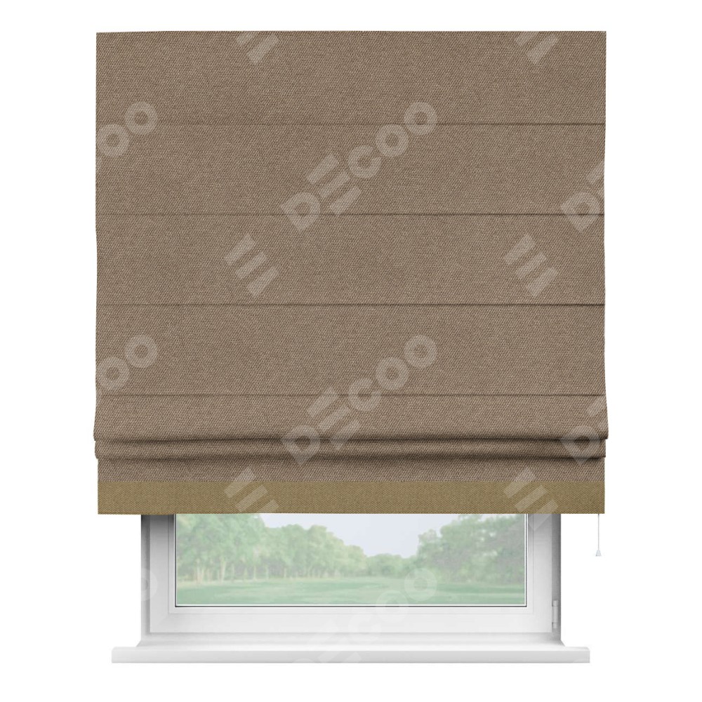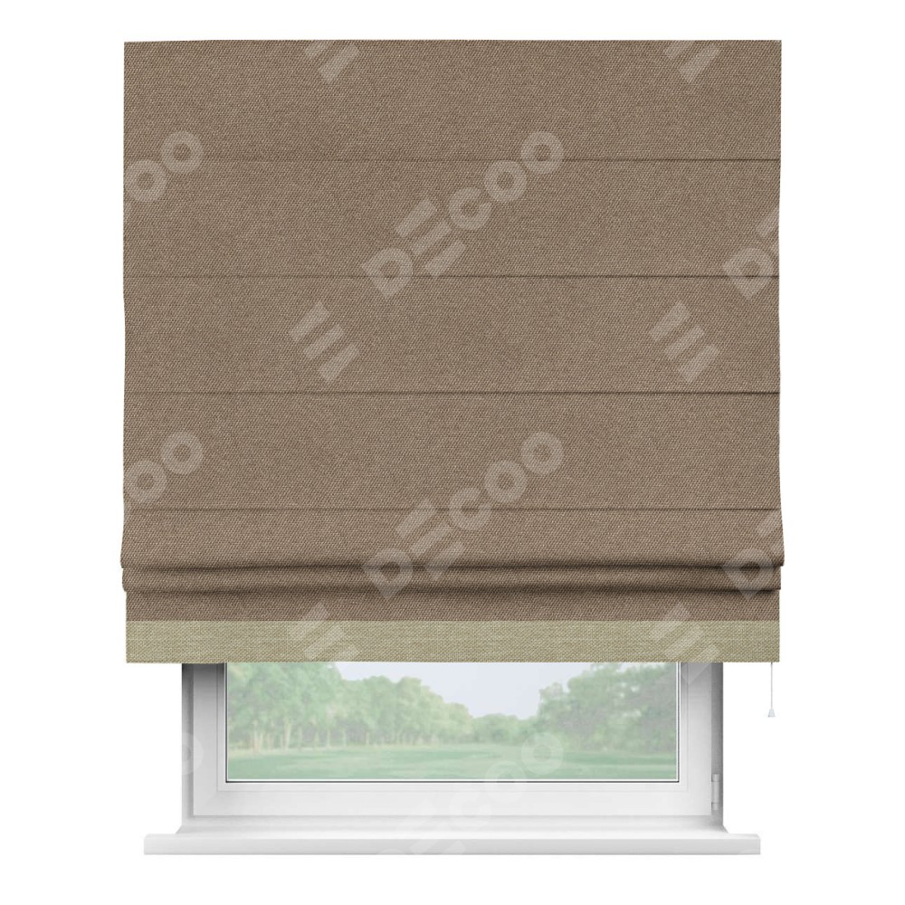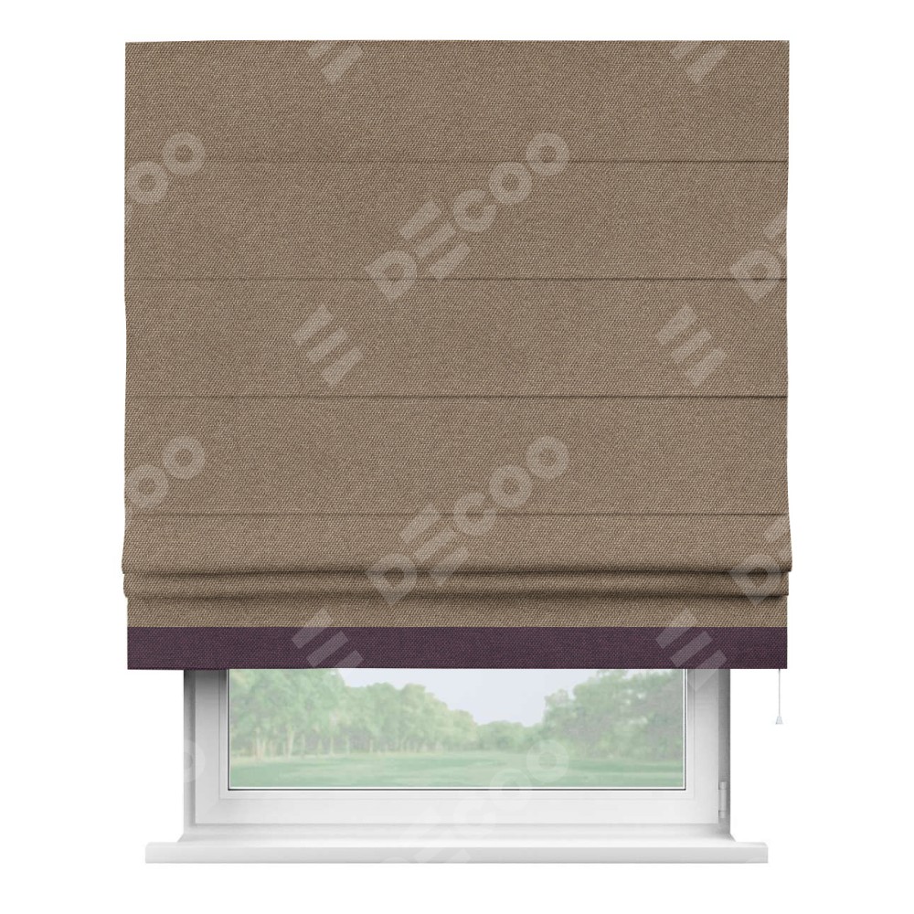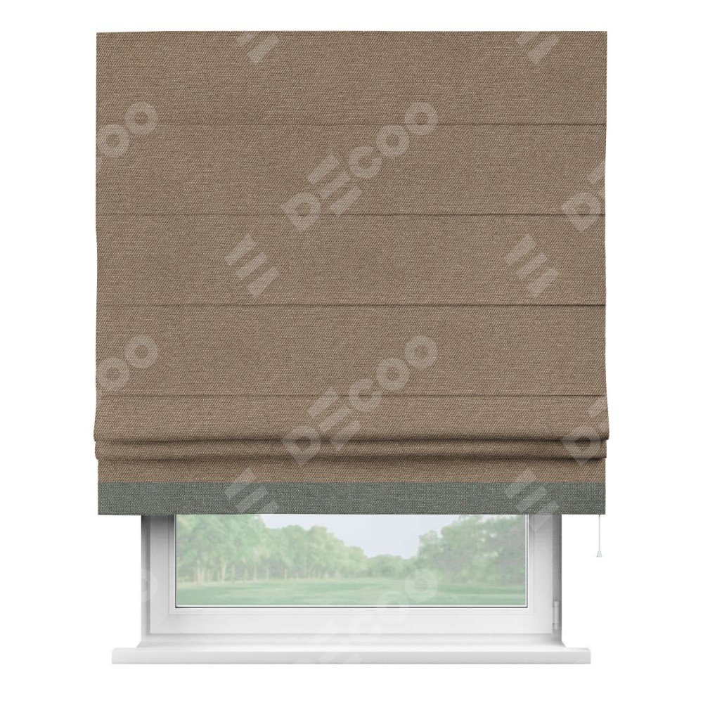 Римская штора производителя «Cortin», используется для проёма, пошита из ткани лён димаут коричневый, артикул 90996. Отделка шторы кантом «Джестер», ткань для канта используется из льна димаут разной расцветки на выбор. Имеет универсальный механизм и подходит для монтажа: на потолок, на стену и в нишу.