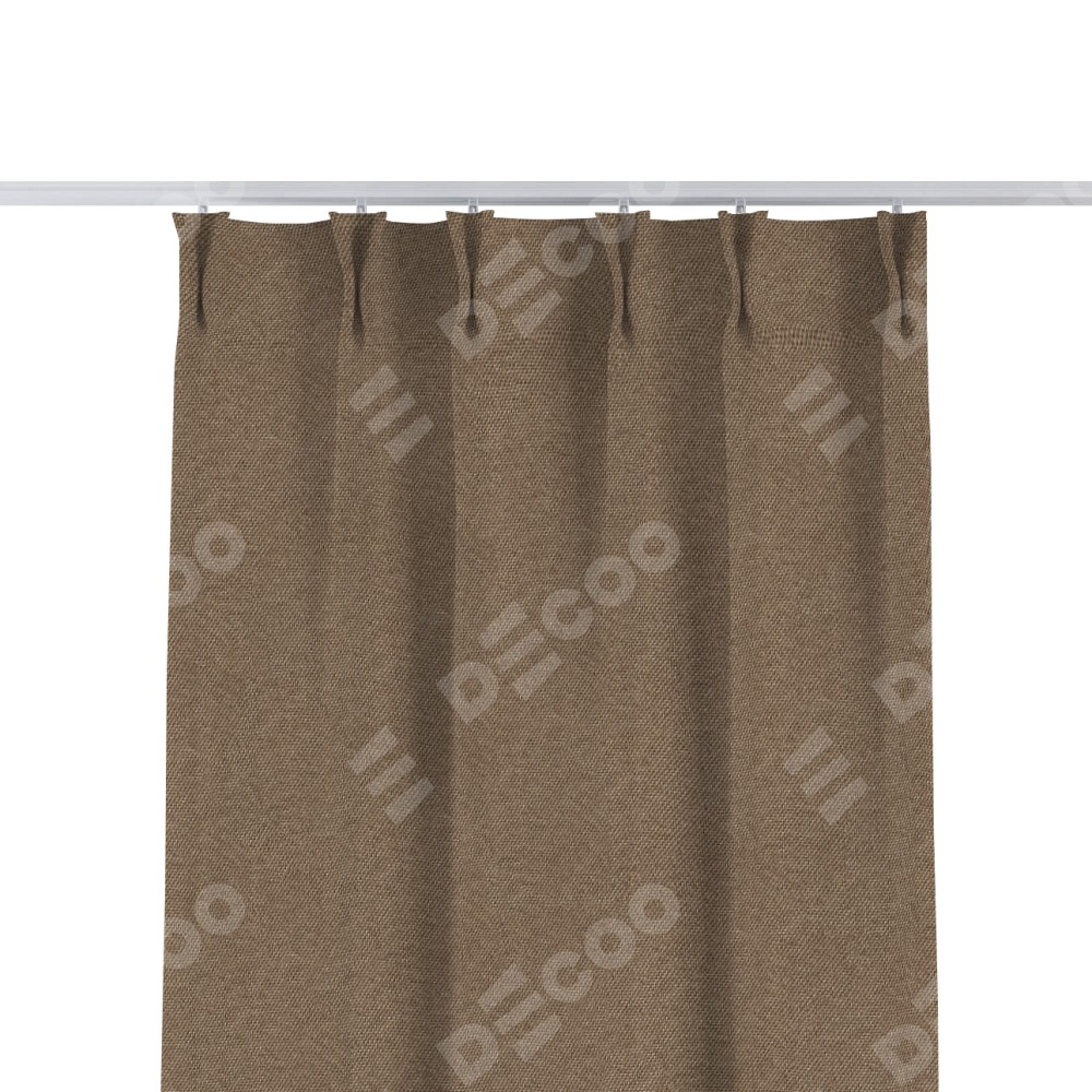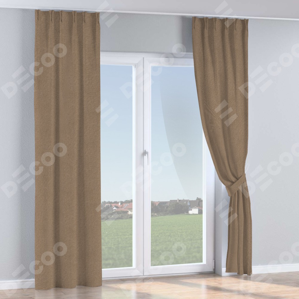 Комплект прямых штор, от производителя «Cortin», пошиты из ткани лён димаут коричневый, артикул ткани 90996. С изнаночной стороны в верхней части штор пристрачивается шторная лента с декоративными складками «Кустик». Для создания элегантных складок прямые шторы шьются по стандарту с коэффициентом 1:2 (на 100 см. ширины проёма 200 см. ширины ткани).