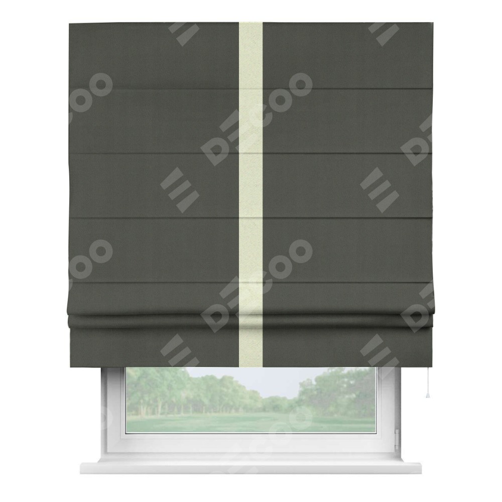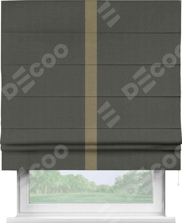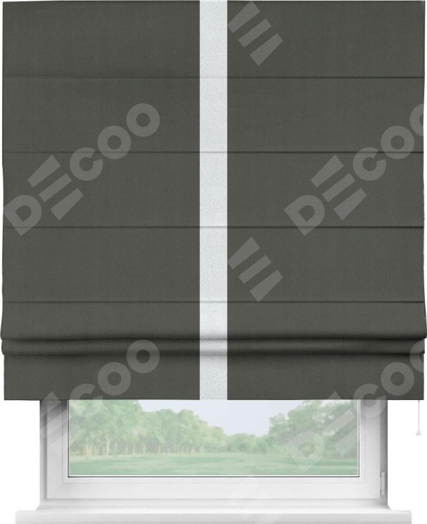 Римская штора производителя «Cortin», используется для проёма, пошита из ткани блэкаут однотонный дымчато-серый, артикул ткани 91571−1. Отделка шторы кантом «Хайвей», ткань для канта используется из блэкаута однотонного разной расцветки на выбор. Имеет универсальный механизм и подходит для монтажа: на потолок, на стену и в нишу.