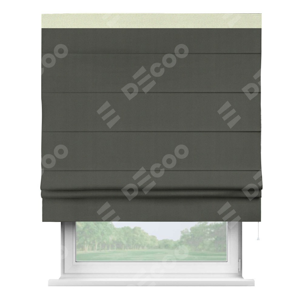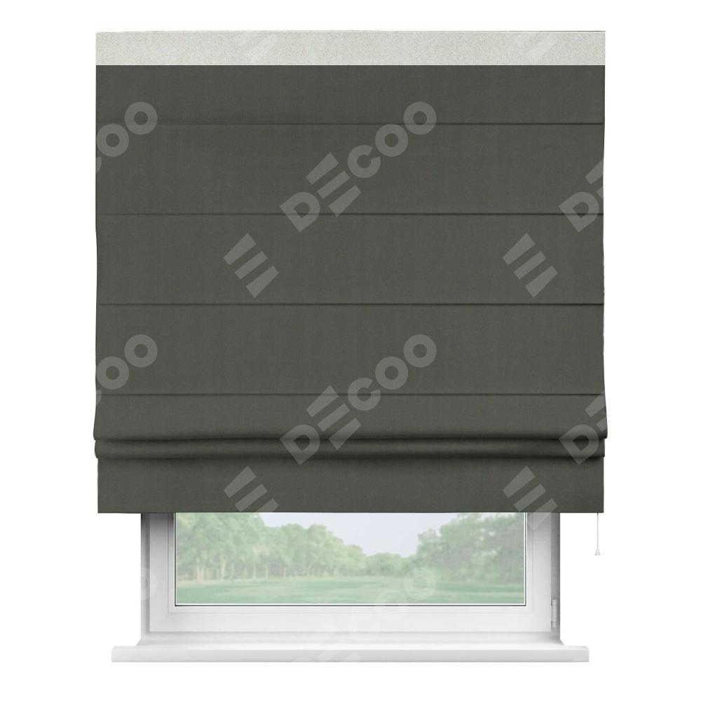 Римская штора производителя «Cortin», используется для проёма, пошита из ткани блэкаут однотонный дымчато-серый, артикул ткани 91571−1. Отделка шторы кантом «Кинг», ткань для канта используется из блэкаута однотонного разной расцветки на выбор. Имеет универсальный механизм и подходит для монтажа: на потолок, на стену и в нишу.