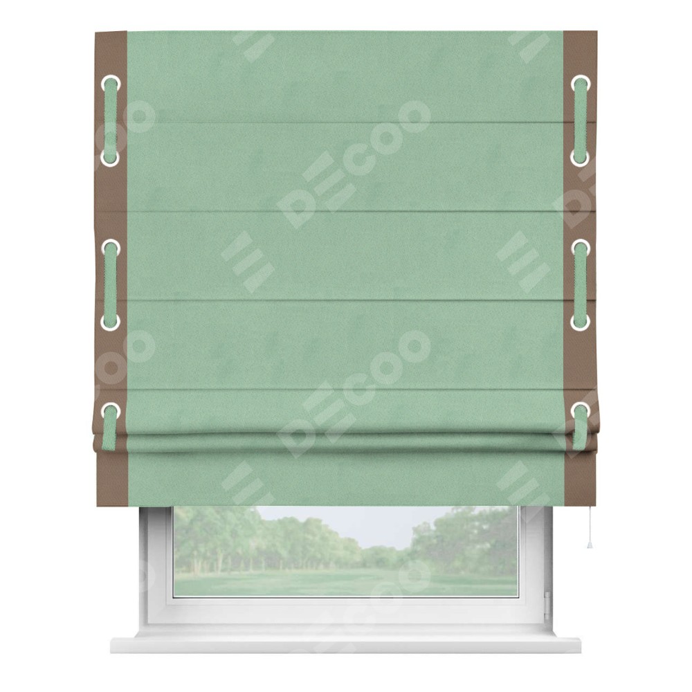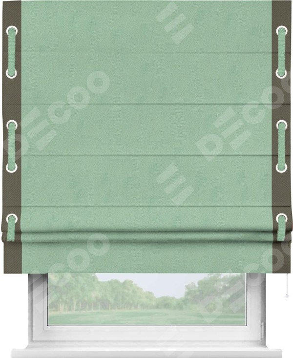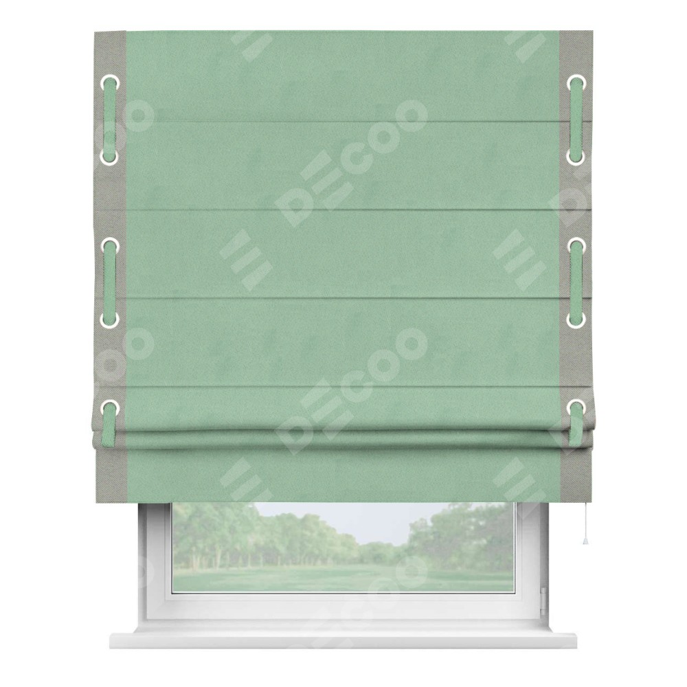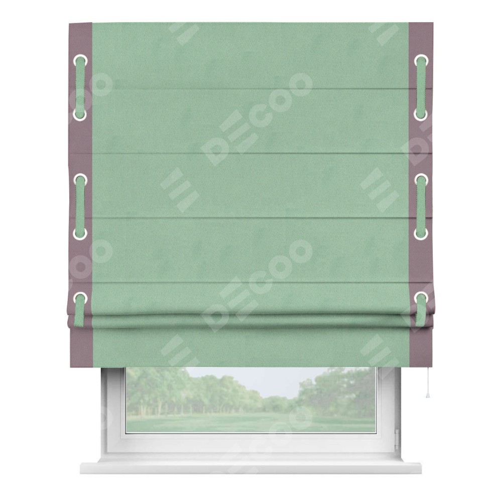 Римская штора производителя «Cortin», используется для проёма, пошита из ткани блэкаут однотонный ментоловый, артикул ткани 91572−1. Отделка шторы кантом «Стрим Дуо» на кантах расположены люверсы с пояском, ткань для канта используется из блэкаута однотонного разной расцветки на выбор. Ткань для пояска обычно используется из основной ткани шторы, а так же можно сделать из любой расцветки по желанию. Имеет универсальный механизм и подходит для монтажа: на потолок, на стену и в нишу.