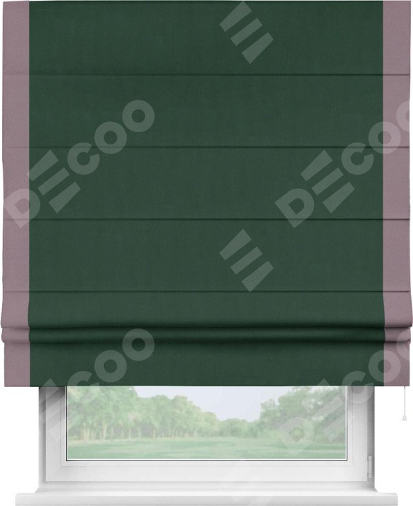 Римская штора производителя «Cortin», используется для проёма, пошита из ткани блэкаут однотонный зелёный, артикул ткани 91572−2. Отделка шторы кантом «Стрим Дуо», ткань для канта используется из блэкаута однотонного разной расцветки на выбор. Имеет универсальный механизм и подходит для монтажа: на потолок, на стену и в нишу.