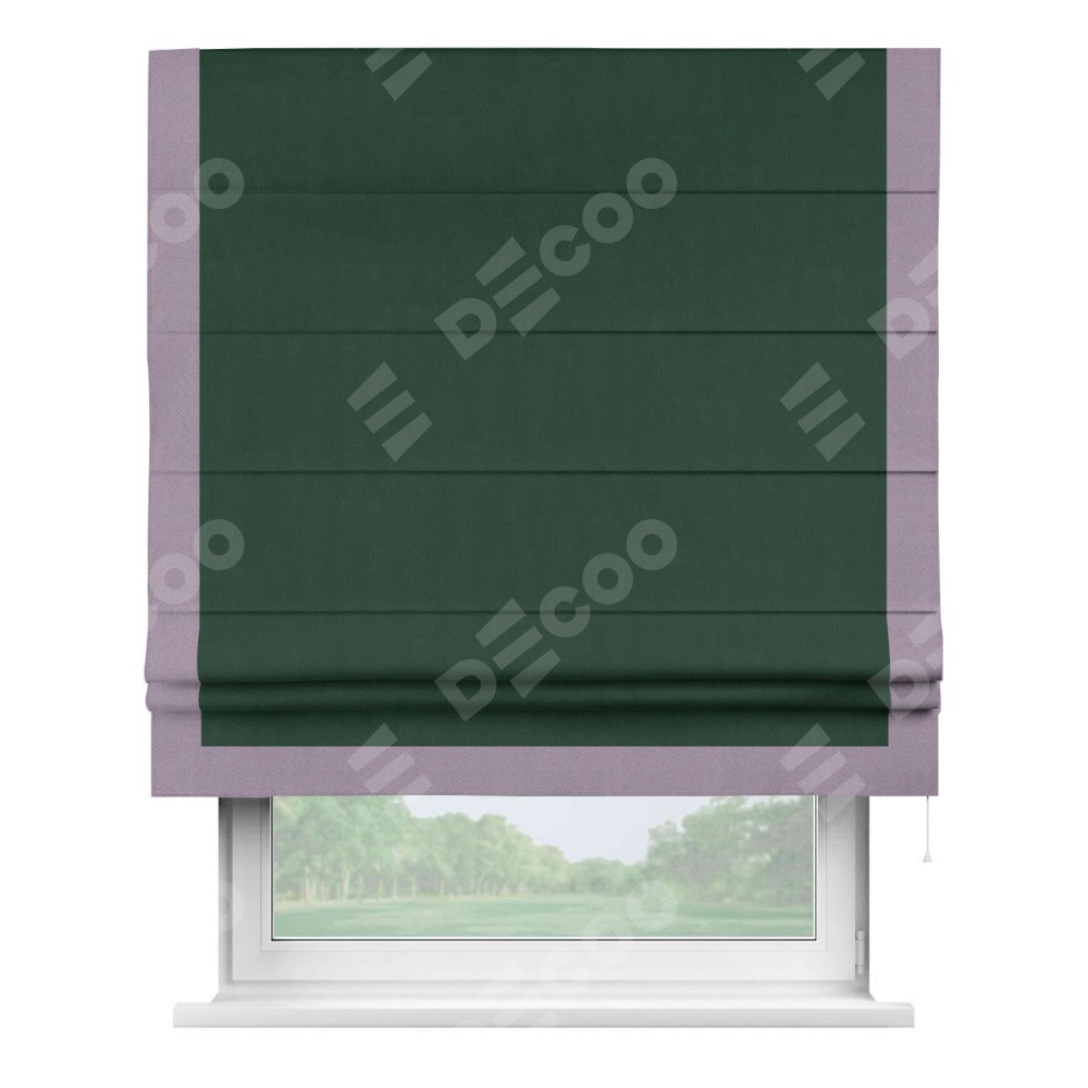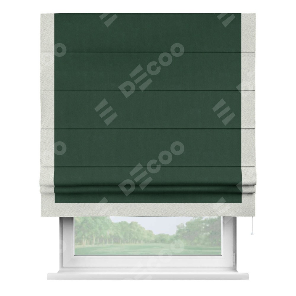 Римская штора производителя «Cortin», используется для проёма, пошита из ткани блэкаут однотонный зелёный, артикул ткани 91572−2. Отделка шторы кантом «Виктория», ткань для канта используется из блэкаута однотонного разной расцветки на выбор. Имеет универсальный механизм и подходит для монтажа: на потолок, на стену и в нишу.