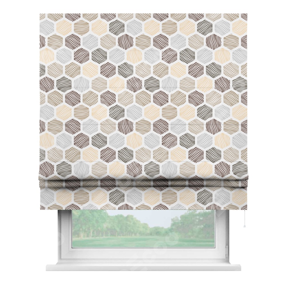 Классическая римская штора производителя «Cortin», пошита из ткани блэкаут с нанесением сублимационной печати «Мозаика соты». Имеет универсальный механизм и подходит для монтажа: на потолок, на стену и в нишу.
