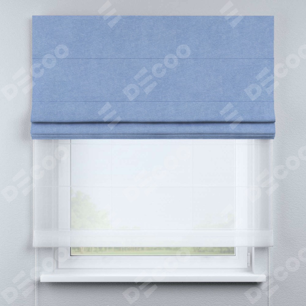 Двойная римская штора «День-ночь» от производителя Cortin предназначена для использования в проёмах. Эта штора уникальна тем, что состоит из двух полотен. На лицевой стороне находится вельвет васильковый (артикул: 33799), обеспечивающий мягкое затемнение. В комплект также входит вторая ткань — легкий белый тюль (артикул: V-01), который добавляет изящества и легкости оформлению окна. Кроме того, доступны и другие разновидности ткани тюль, выбор которых доступен по  ссылке .