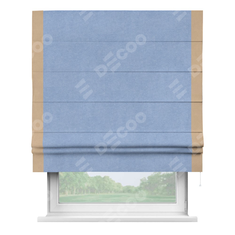 Римская штора производителя «Cortin», используется для проёма, пошита из ткани вельвет васильковый, артикул ткани 33799. Отделка шторы кантом «Стрим Дуо», ткань для канта используется из вельвета разной расцветки на выбор. Имеет универсальный механизм и подходит для монтажа: на потолок, на стену и в нишу.