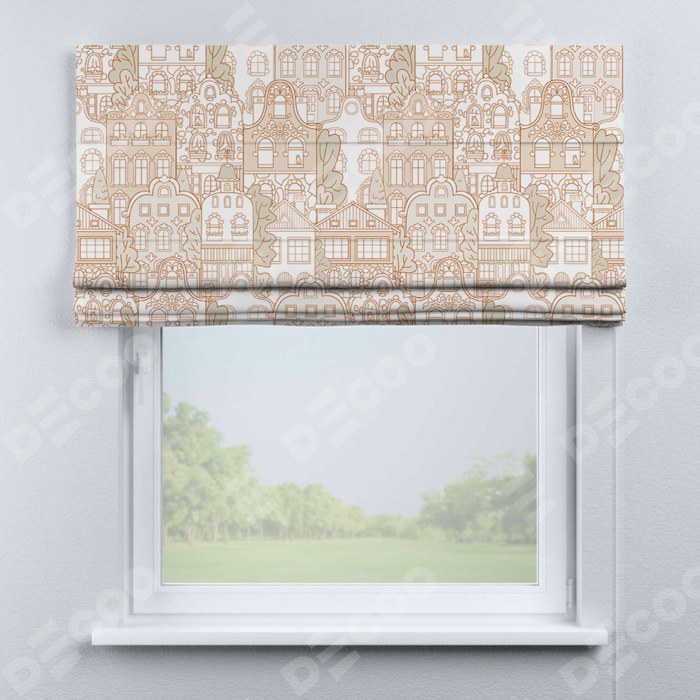Классическая римская штора производителя «Cortin», пошита из ткани блэкаут с нанесением сублимационной печати «Милый городок». Имеет универсальный механизм и подходит для монтажа: на потолок, на стену и в нишу.
