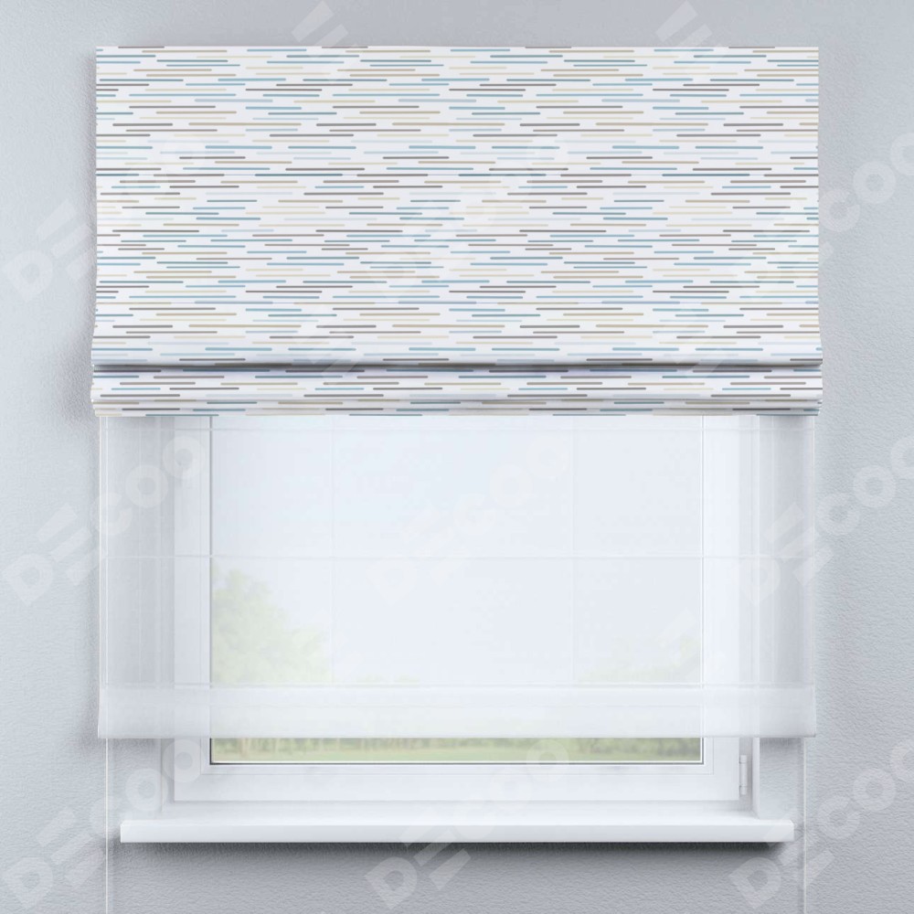 Двойная римская штора «День-ночь» от производителя Cortin предназначена для использования в проёмах. Эта штора уникальна тем, что состоит из двух полотен. На лицевой стороне находится блэкаут с нанесением сублимационной печати «Стелс», обеспечивающий эффективное затемнение. В комплект также входит вторая ткань — легкий белый тюль (артикул: V-01), который добавляет изящества и легкости оформлению окна. Кроме того, доступны и другие разновидности ткани тюль, выбор которых доступен по  ссылке .