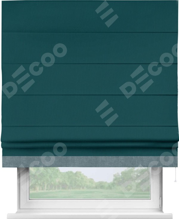 Римская штора производителя «Cortin», используется для проёма, пошита из ткани канвас изумрудный, артикул ткани v-12487. Отделка шторы кантом «Джестер» (серо-голубой v-330), ткань для канта используется из канваса разной расцветки на выбор. Имеет универсальный механизм и подходит для монтажа: на потолок, на стену и в нишу.