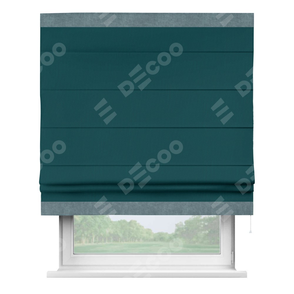 Римская штора производителя «Cortin», используется для проёма, пошита из ткани канвас изумрудный, артикул ткани v-12487. Отделка шторы кантом «Горизонт» (серо-голубой v-330), ткань для канта используется из канваса разной расцветки на выбор. Имеет универсальный механизм и подходит для монтажа: на потолок, на стену и в нишу.