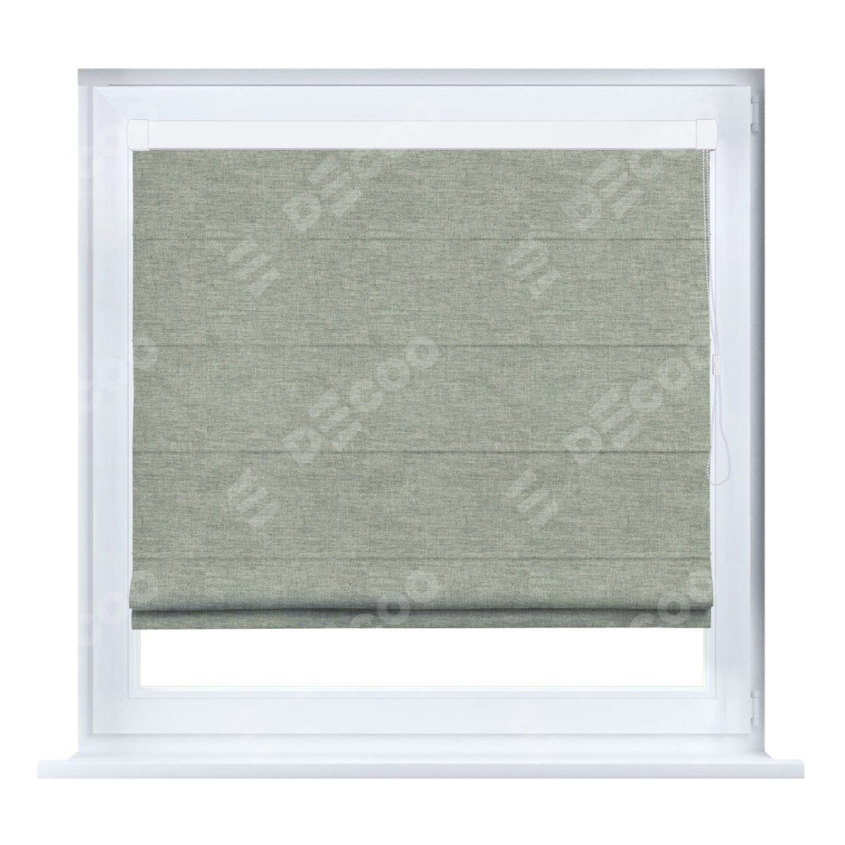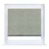 Римская штора кассетного типа, производителя «Cortin», устанавливается только на пластиковые окна и прилегает к стеклопакету, пошита из ткани лён кашемир серо-зелёный, артикул 21618.