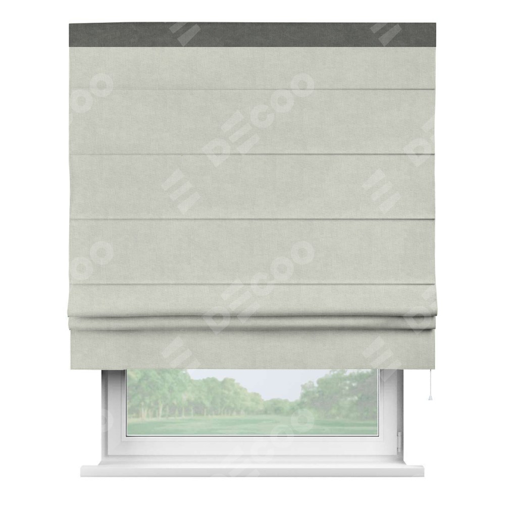 Римская штора производителя «Cortin», используется для проёма, пошита из ткани канвас светло-серый, артикул ткани v-371. Отделка шторы кантом «Кинг» (тёмно-серый v-340), ткань для канта используется из канваса разной расцветки на выбор. Имеет универсальный механизм и подходит для монтажа: на потолок, на стену и в нишу.