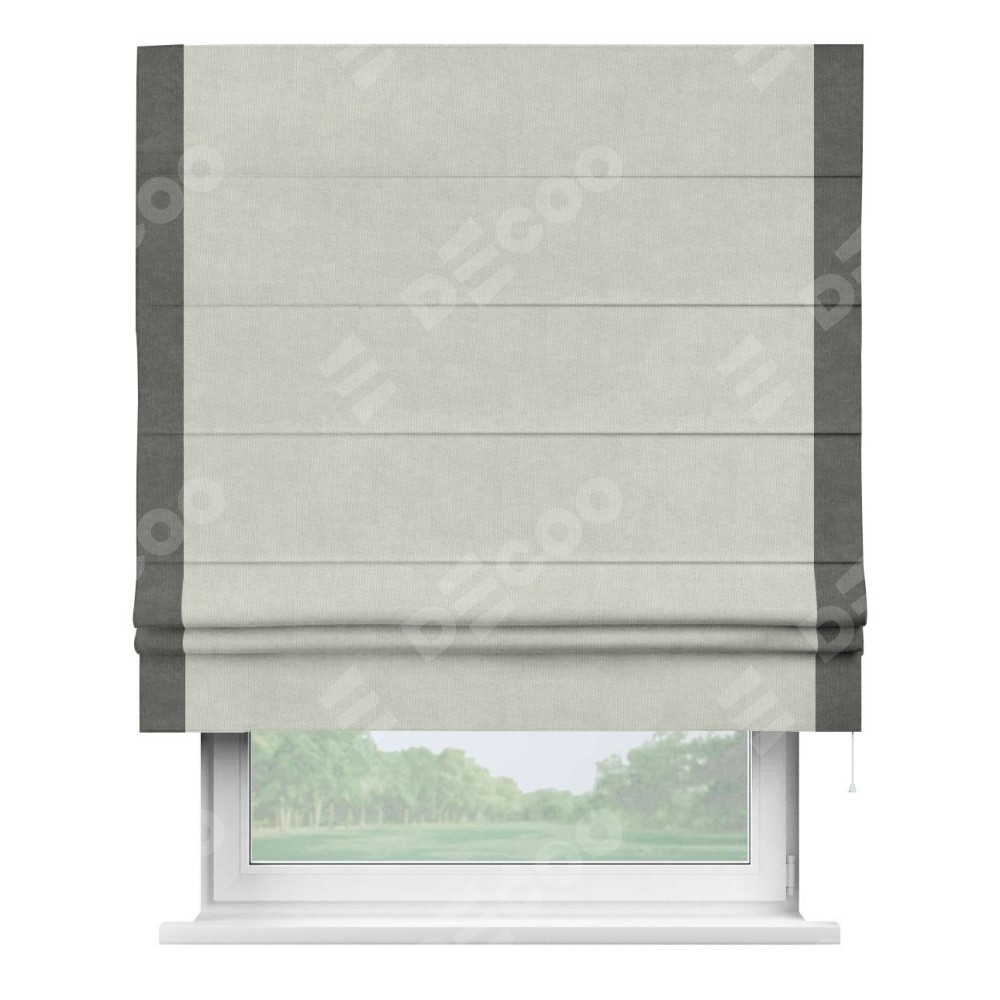 Римская штора производителя «Cortin», используется для проёма, пошита из ткани канвас светло-серый, артикул ткани v-371. Отделка шторы кантом «Стрим Дуо» (тёмно-серый v-340), ткань для канта используется из канваса разной расцветки на выбор. Имеет универсальный механизм и подходит для монтажа: на потолок, на стену и в нишу.