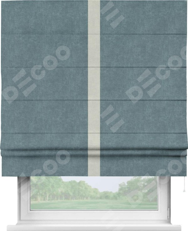 Римская штора производителя «Cortin», используется для проёма, пошита из ткани канвас серо-голубой, артикул ткани v-330. Отделка шторы кантом «Хайвей» (светло-серый v-371), ткань для канта используется из канваса разной расцветки на выбор. Имеет универсальный механизм и подходит для монтажа: на потолок, на стену и в нишу.