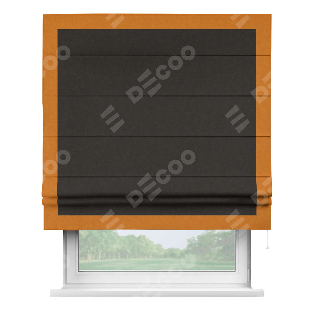 Римская штора производителя «Cortin», используется для проёма, пошита из ткани канвас тёмно-коричневый, артикул ткани v-13. Отделка шторы кантом «Чесс» (оранжевый v-106), ткань для канта используется из канваса разной расцветки на выбор. Имеет универсальный механизм и подходит для монтажа: на потолок, на стену и в нишу.