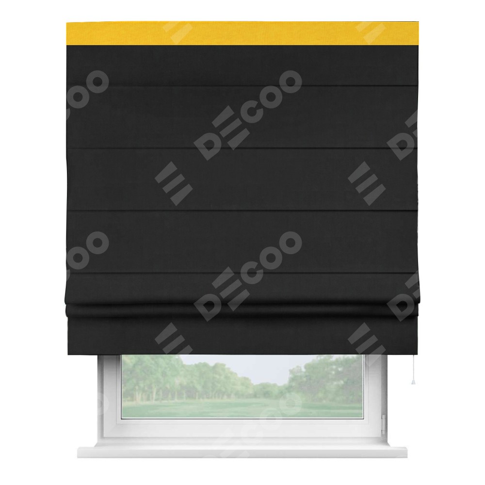 Римская штора производителя «Cortin», используется для проёма, пошита из ткани канвас черный, артикул ткани v-194. Отделка шторы кантом «Кинг» (желтый v-344), ткань для канта используется из канваса разной расцветки на выбор. Имеет универсальный механизм и подходит для монтажа: на потолок, на стену и в нишу.