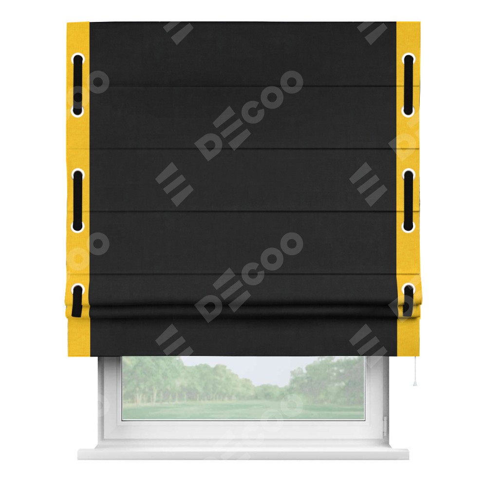 Римская штора производителя «Cortin», используется для проёма, пошита из ткани канвас черный, артикул ткани v-194. Отделка шторы кантом «Стрим Дуо» (желтый v-344) на кантах расположены люверсы с пояском, ткань для канта используется из канваса разной расцветки на выбор. Ткань для пояска обычно используется из основной ткани шторы, а так же можно сделать из любой расцветки по желанию. Имеет универсальный механизм и подходит для монтажа: на потолок, на стену и в нишу.
