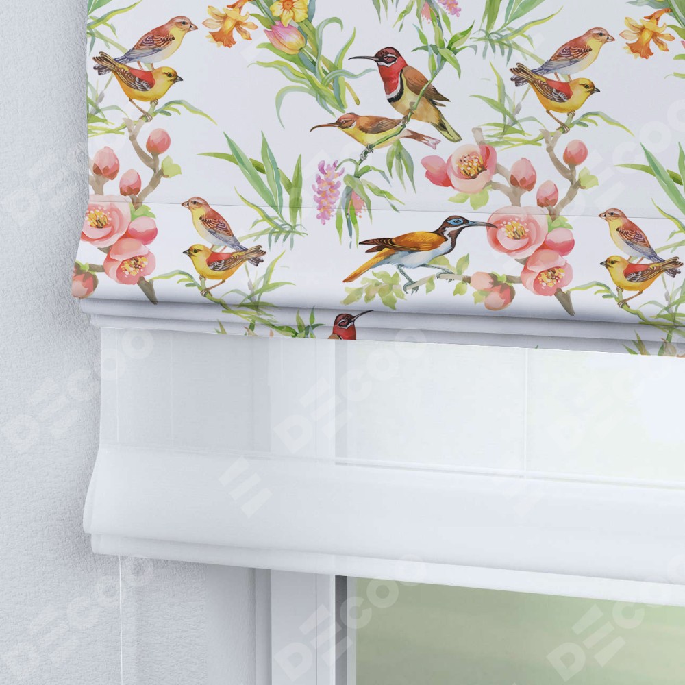 Двойная римская штора «День-ночь» от производителя Cortin предназначена для использования в проёмах. Эта штора уникальна тем, что состоит из двух полотен. На лицевой стороне находится блэкаут с нанесением сублимационной печати «Певчие птички», обеспечивающий эффективное затемнение. В комплект также входит вторая ткань — легкий белый тюль (артикул: V-01), который добавляет изящества и легкости оформлению окна. Кроме того, доступны и другие разновидности ткани тюль, выбор которых доступен по ссылке .
