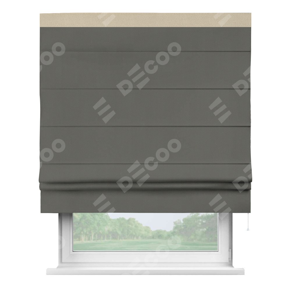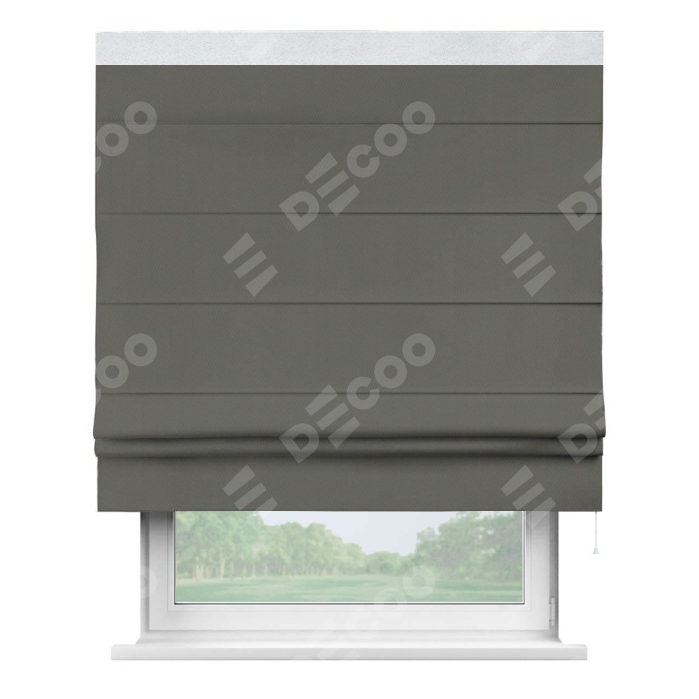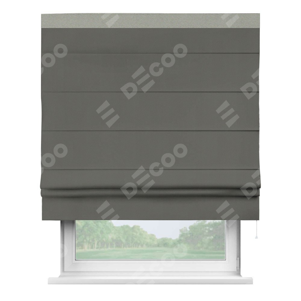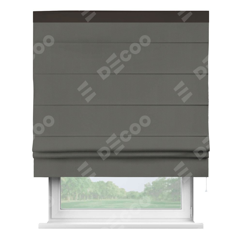 Римская штора производителя «Cortin», используется для проёма, пошита из ткани блэкаут однотонный тёмно-серый, артикул ткани 91570. Отделка шторы кантом «Кинг», ткань для канта используется из блэкаута однотонного разной расцветки на выбор. Имеет универсальный механизм и подходит для монтажа: на потолок, на стену и в нишу.
