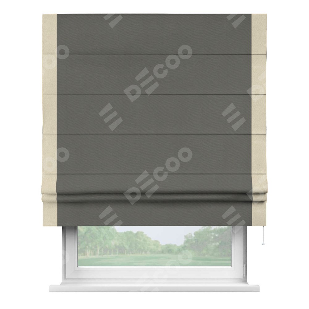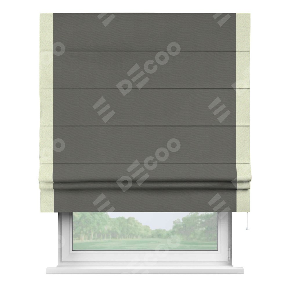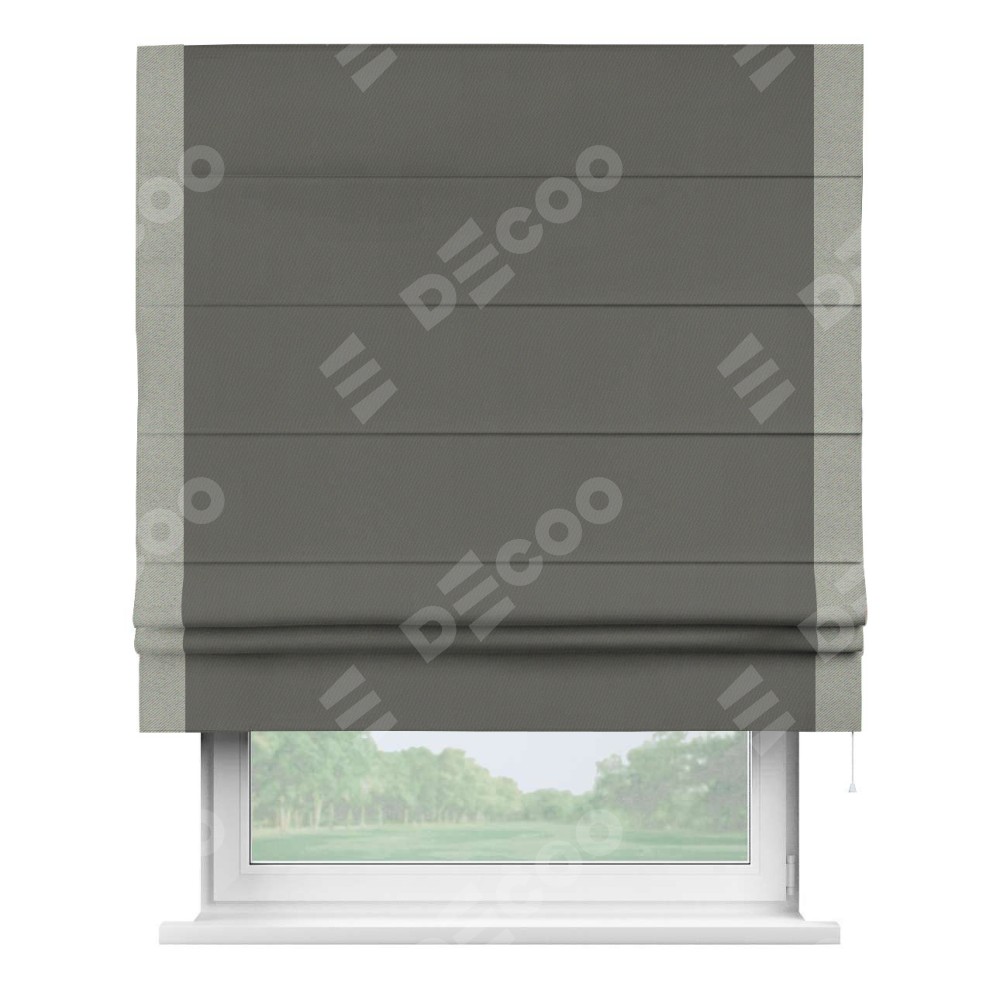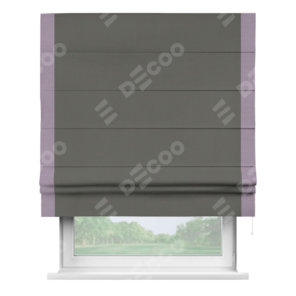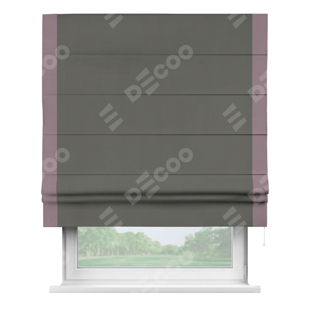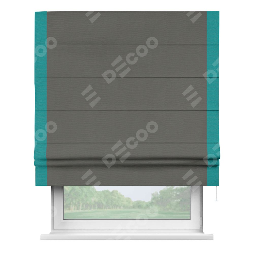 Римская штора производителя «Cortin», используется для проёма, пошита из ткани блэкаут однотонный тёмно-серый, артикул ткани 91570. Отделка шторы кантом «Стрим Дуо», ткань для канта используется из блэкаута однотонного разной расцветки на выбор. Имеет универсальный механизм и подходит для монтажа: на потолок, на стену и в нишу.