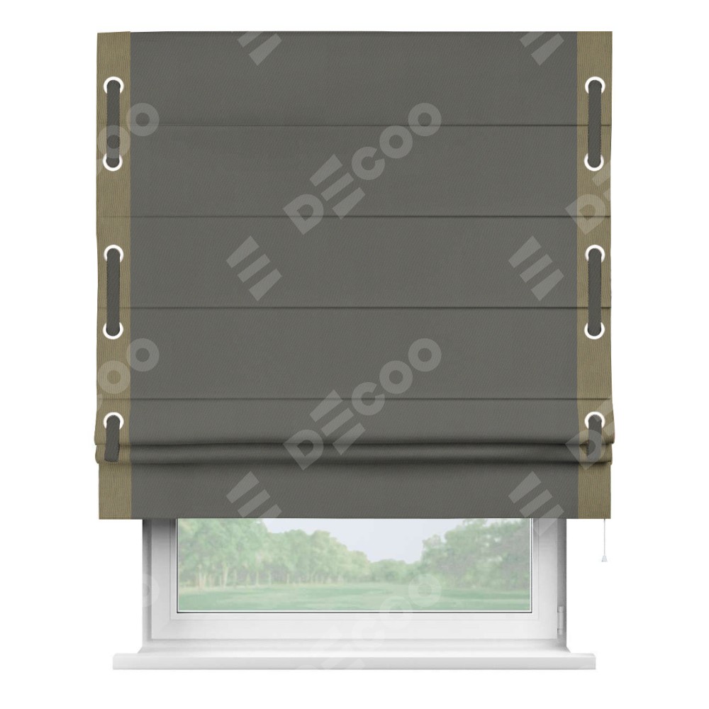 Римская штора производителя «Cortin», используется для проёма, пошита из ткани блэкаут однотонный тёмно-серый, артикул ткани 91570. Отделка шторы кантом «Стрим Дуо» на кантах расположены люверсы с пояском, ткань для канта используется из блэкаута однотонного разной расцветки на выбор. Ткань для пояска обычно используется из основной ткани шторы, а так же можно сделать из любой расцветки по желанию. Имеет универсальный механизм и подходит для монтажа: на потолок, на стену и в нишу.