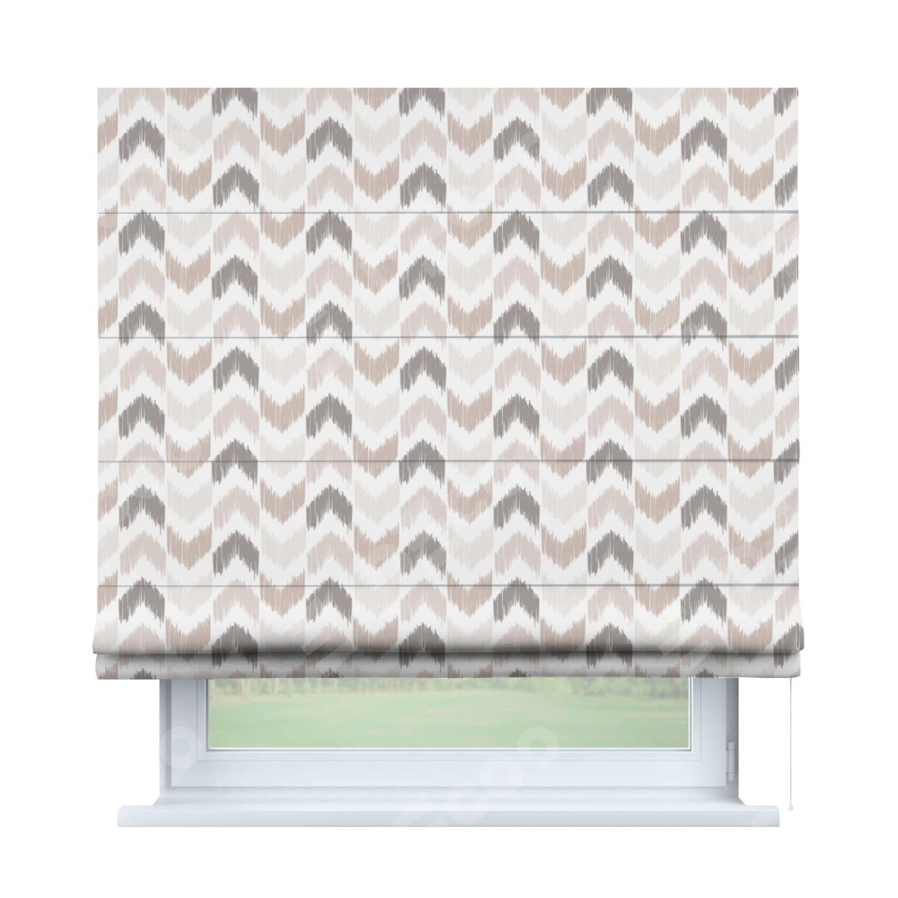 Классическая римская штора производителя «Cortin», пошита из ткани блэкаут с нанесением сублимационной печати «Икат стрелки». Имеет универсальный механизм и подходит для монтажа: на потолок, на стену и в нишу.