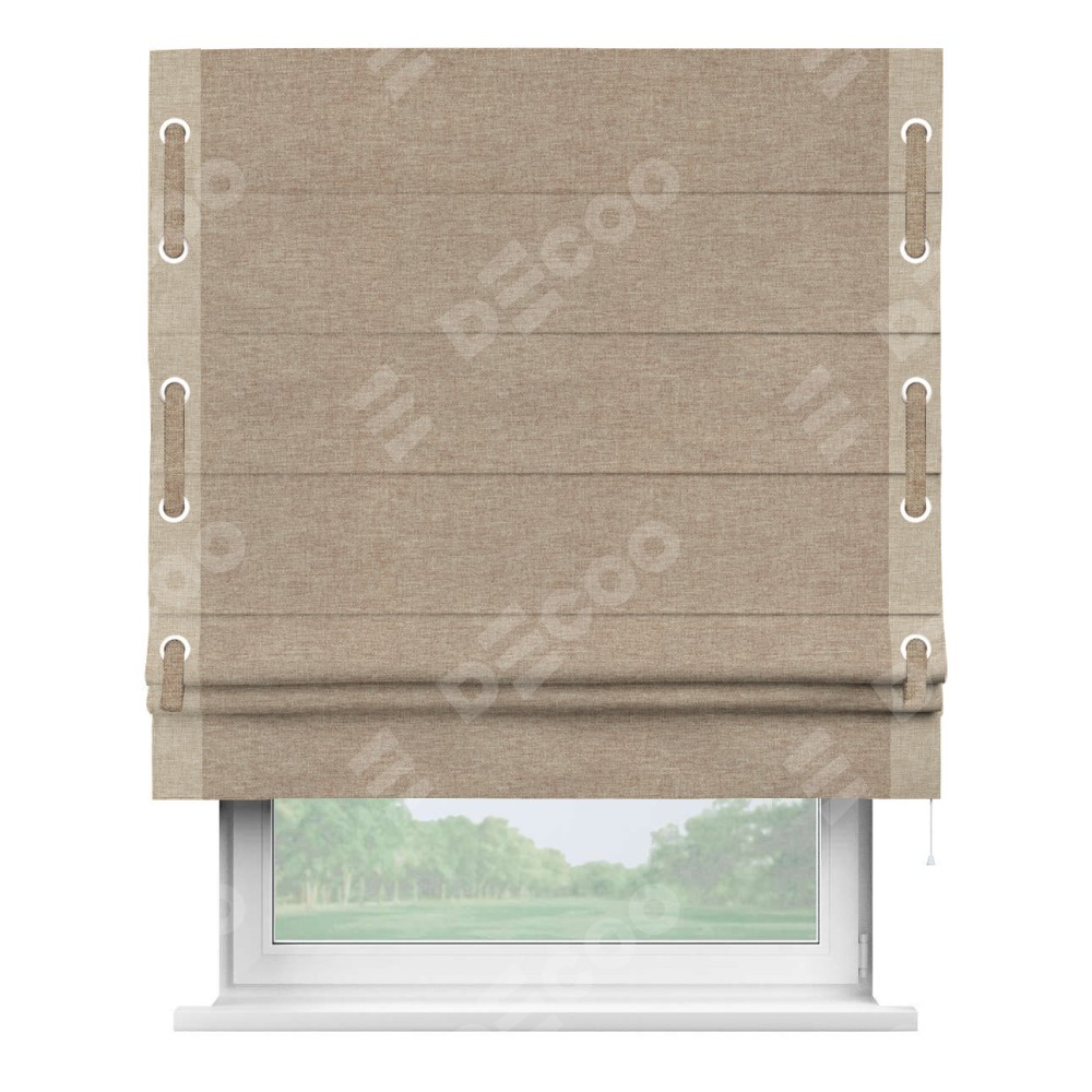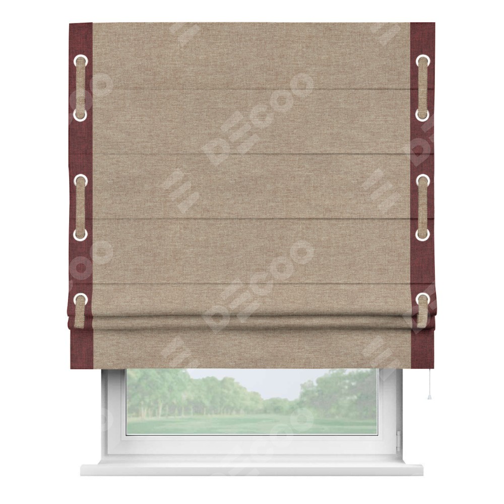 Римская штора производителя «Cortin», используется для проёма, пошита из ткани лён кашемир коричневый, артикул 21614. Отделка шторы кантом «Стрим Дуо» на кантах расположены люверсы с пояском, ткань для канта используется из льна разной расцветки на выбор. Ткань для пояска обычно используется из основной ткани шторы, а так же можно сделать из любой расцветки по желанию. Имеет универсальный механизм и подходит для монтажа: на потолок, на стену и в нишу.