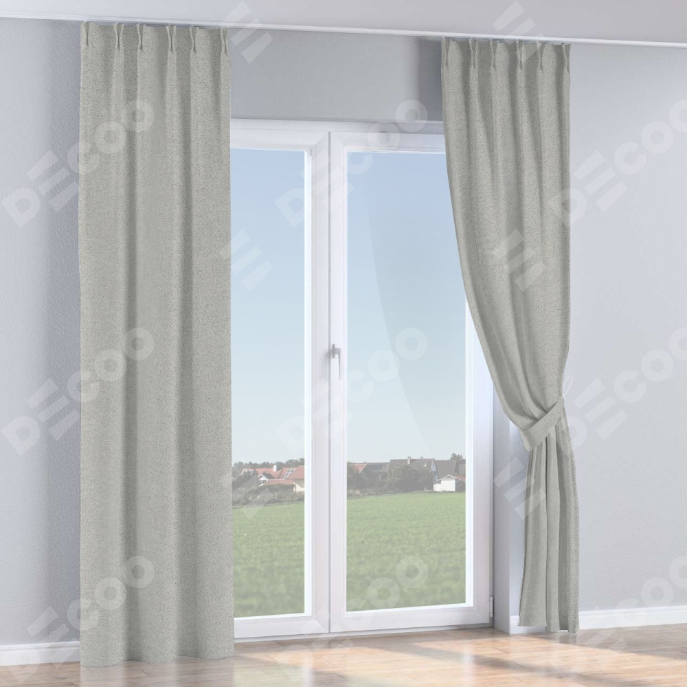 Комплект прямых штор, от производителя «Cortin», пошиты из ткани твид блэкаут светло-серый, артикул ткани 90936. С изнаночной стороны в верхней части штор пристрачивается шторная лента с декоративными складками «Кустик». Для создания элегантных складок прямые шторы шьются по стандарту с коэффициентом 1:2 (на 100 см. ширины проёма 200 см. ширины ткани).