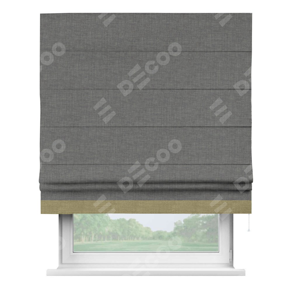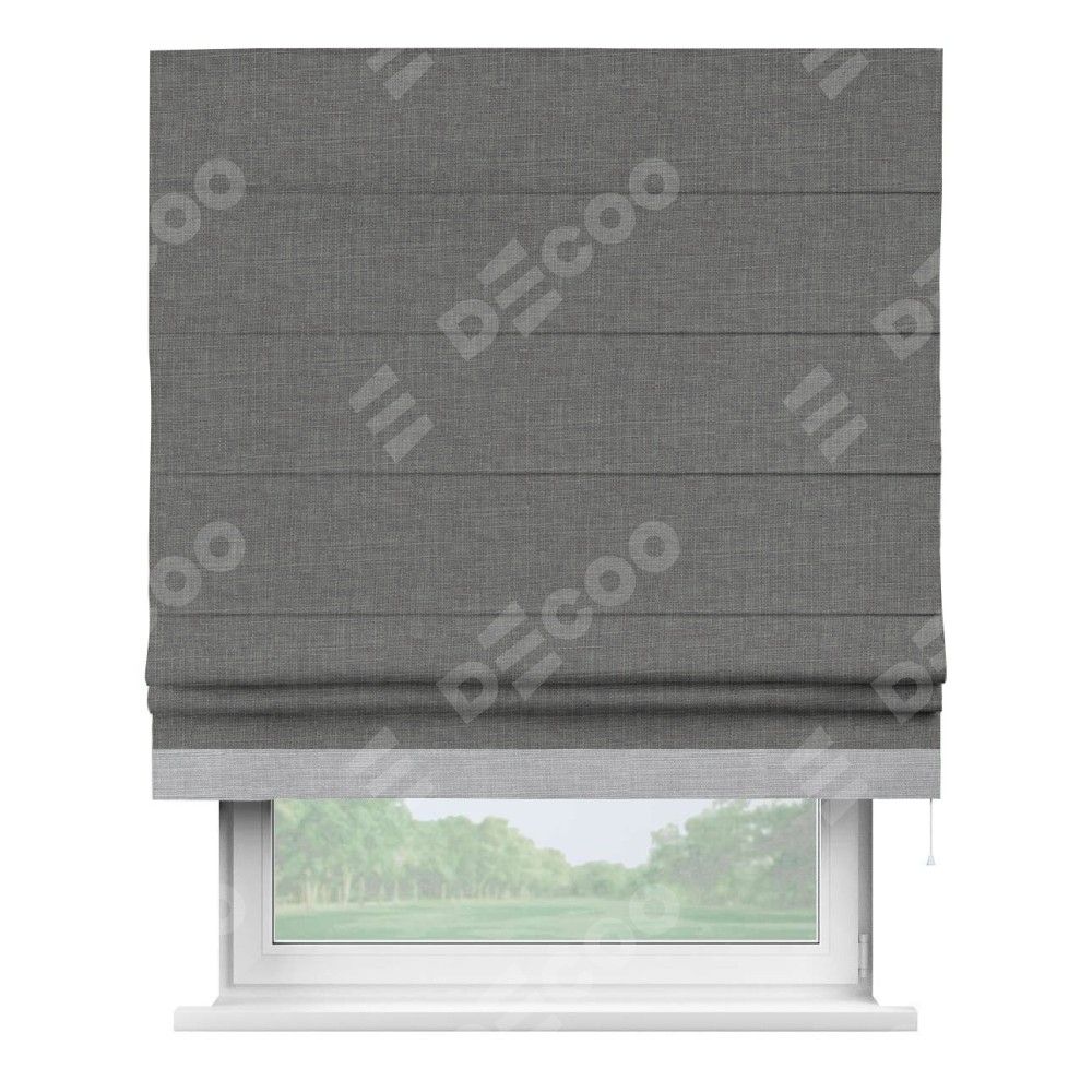 Римская штора производителя «Cortin», используется для проёма, пошита из ткани лён тёмно-серый, артикул 7441. Отделка шторы кантом «Джестер», ткань для канта используется из льна разной расцветки на выбор. Имеет универсальный механизм и подходит для монтажа: на потолок, на стену и в нишу.