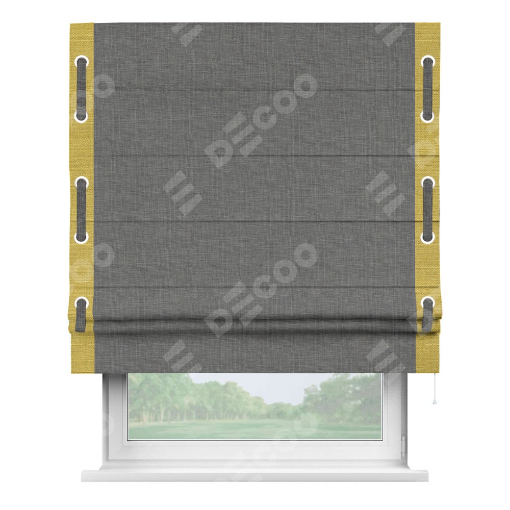 Римская штора производителя «Cortin», используется для проёма, пошита из ткани лён тёмно-серый, артикул 7441. Отделка шторы кантом «Стрим Дуо» на кантах расположены люверсы с пояском, ткань для канта используется из льна разной расцветки на выбор. Ткань для пояска обычно используется из основной ткани шторы, а так же можно сделать из любой расцветки по желанию. Имеет универсальный механизм и подходит для монтажа: на потолок, на стену и в нишу.