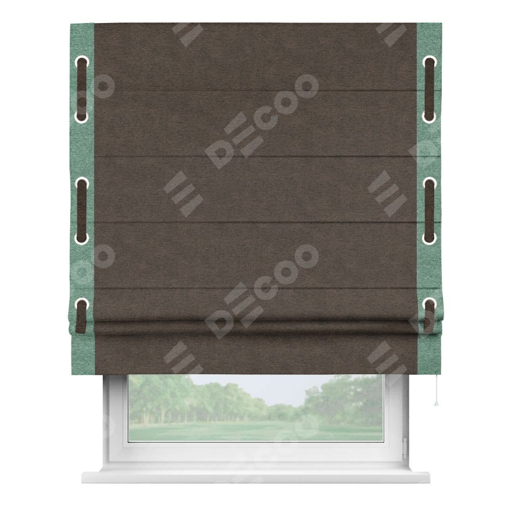 Римская штора производителя «Cortin», используется для проёма, пошита из ткани твид блэкаут тёмно-коричневый, артикул 90933. Отделка шторы кантом «Стрим Дуо» на кантах расположены люверсы с пояском, ткань для канта используется из твида разной расцветки на выбор. Ткань для пояска обычно используется из основной ткани шторы, а так же можно сделать из любой расцветки по желанию. Имеет универсальный механизм и подходит для монтажа: на потолок, на стену и в нишу.