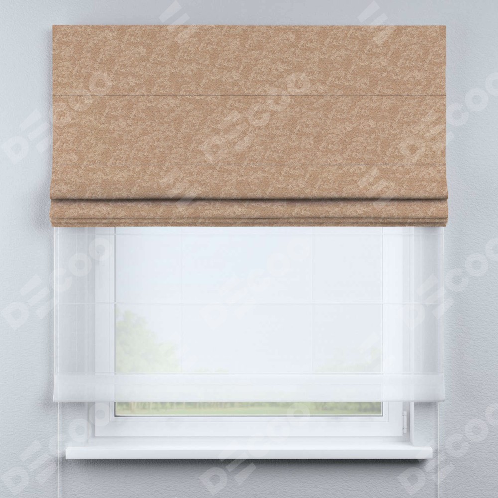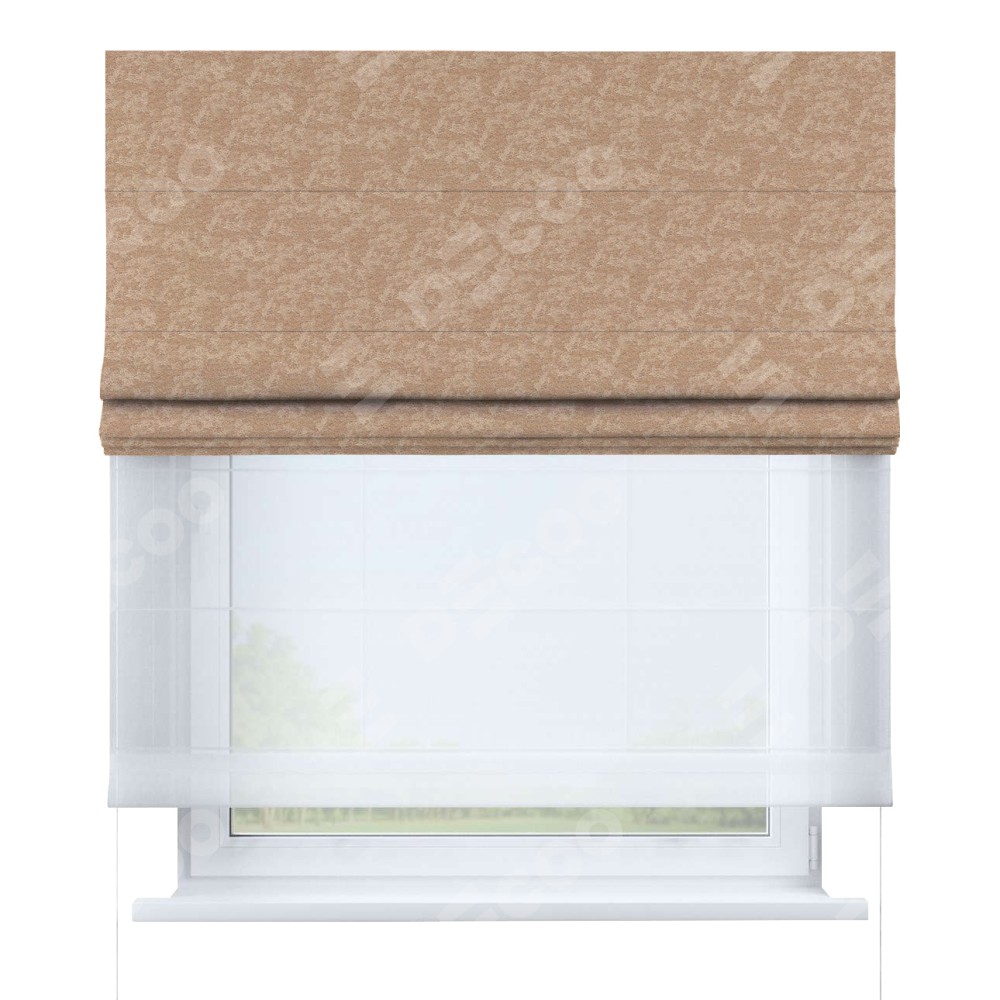 Двойная римская штора «День-ночь» от производителя Cortin предназначена для использования в проёмах. Эта штора уникальна тем, что состоит из двух полотен. На лицевой стороне находится софт мрамор бронзовый (артикул: 93576), обеспечивающий эффективное затемнение. В комплект также входит вторая ткань — легкий белый тюль (артикул: V-01), который добавляет изящества и легкости оформлению окна. Кроме того, доступны и другие разновидности ткани тюль, выбор которых доступен по ссылке .