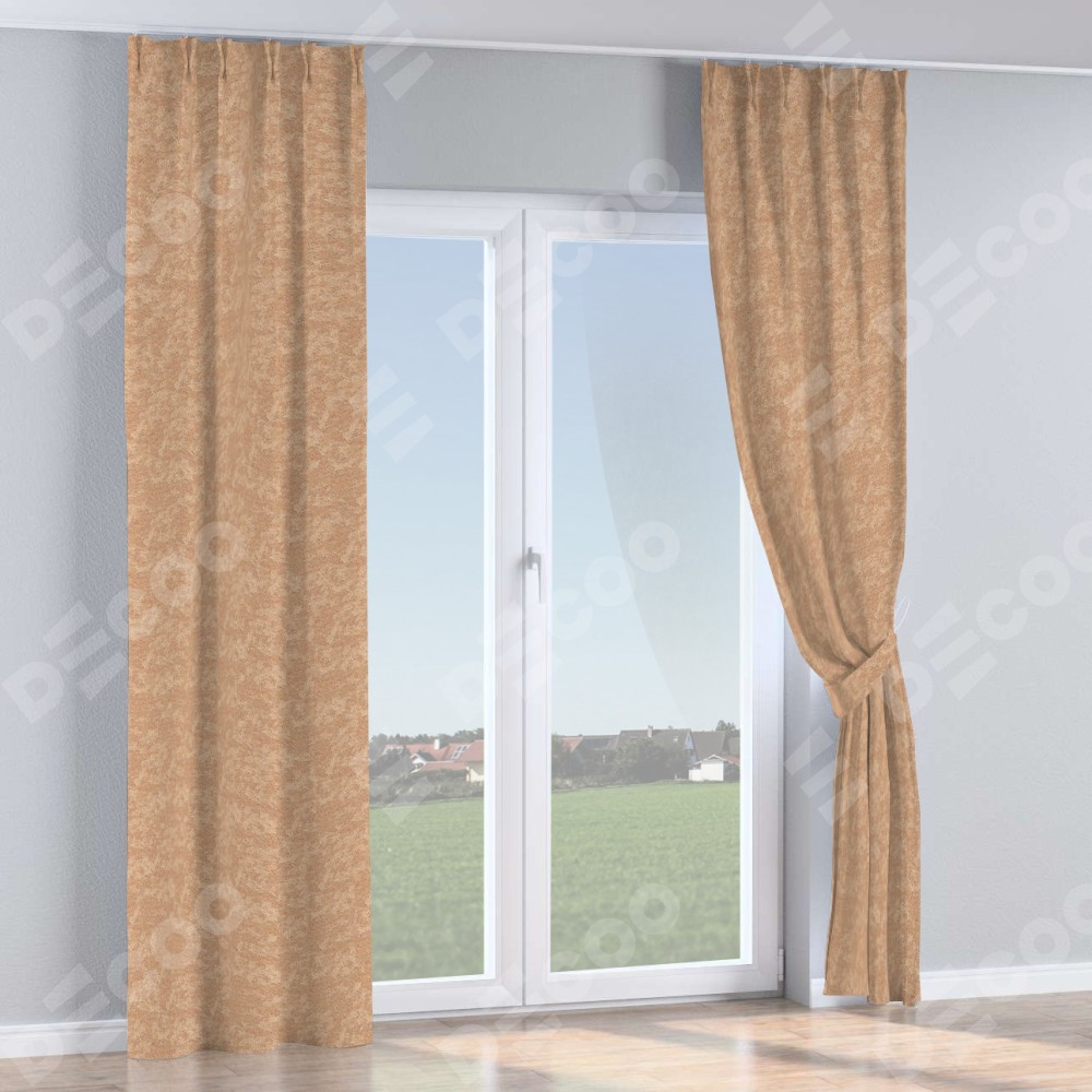 Комплект прямых штор, от производителя «Cortin», пошиты из ткани софт мрамор бронзовый, артикул ткани 93576. С изнаночной стороны в верхней части штор пристрачивается шторная лента с декоративными складками «Кустик». Для создания элегантных складок прямые шторы шьются по стандарту с коэффициентом 1:2 (на 100 см. ширины проёма 200 см. ширины ткани).