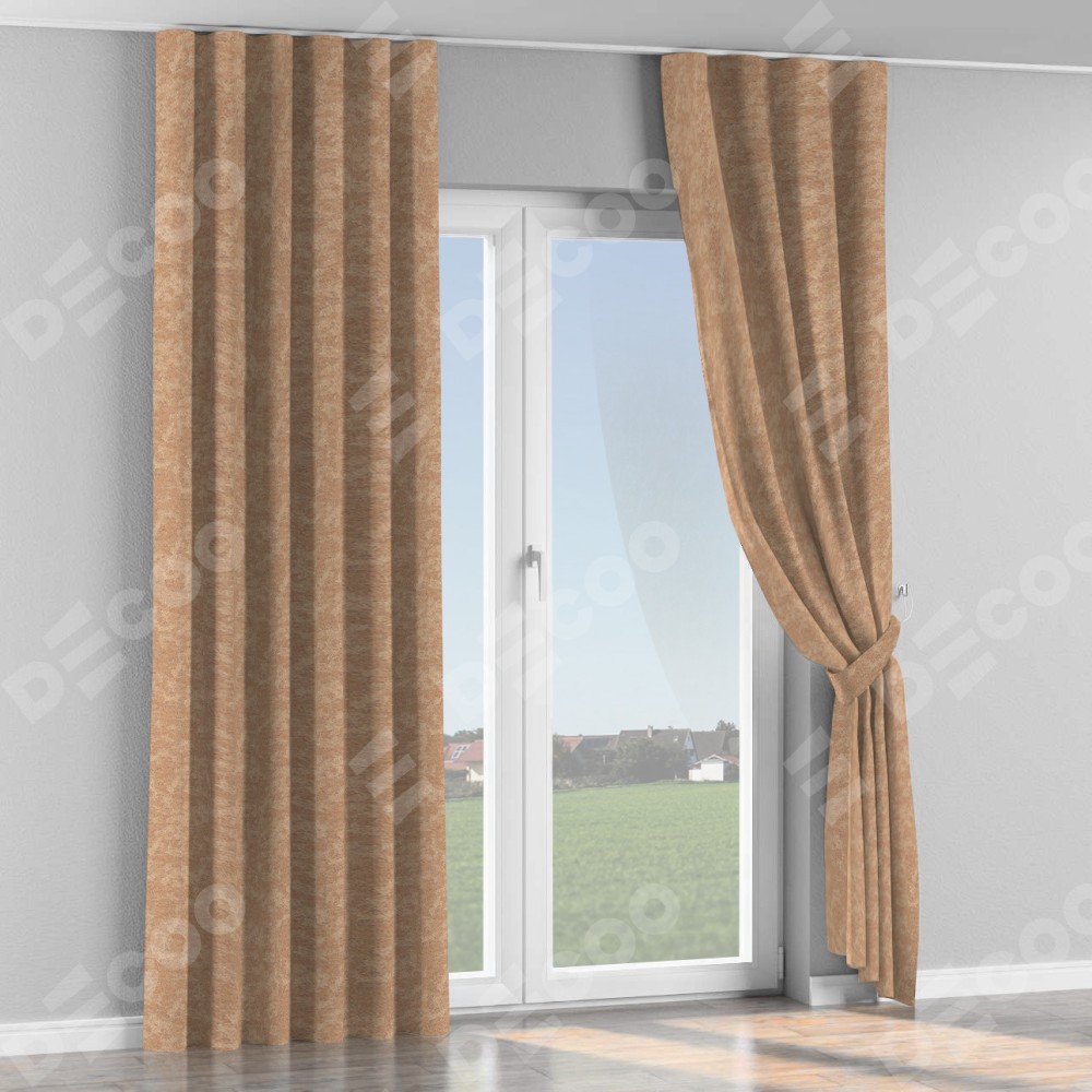 Комплект прямых штор, от производителя «Cortin», пошиты из ткани софт мрамор бронзовый, артикул ткани 93576. С изнаночной стороны в верхней части штор пристрачивается шторная лента с декоративными складками «Волна». Для создания элегантных складок прямые шторы шьются по стандарту с коэффициентом 1:2 (на 100 см. ширины проёма 200 см. ширины ткани).