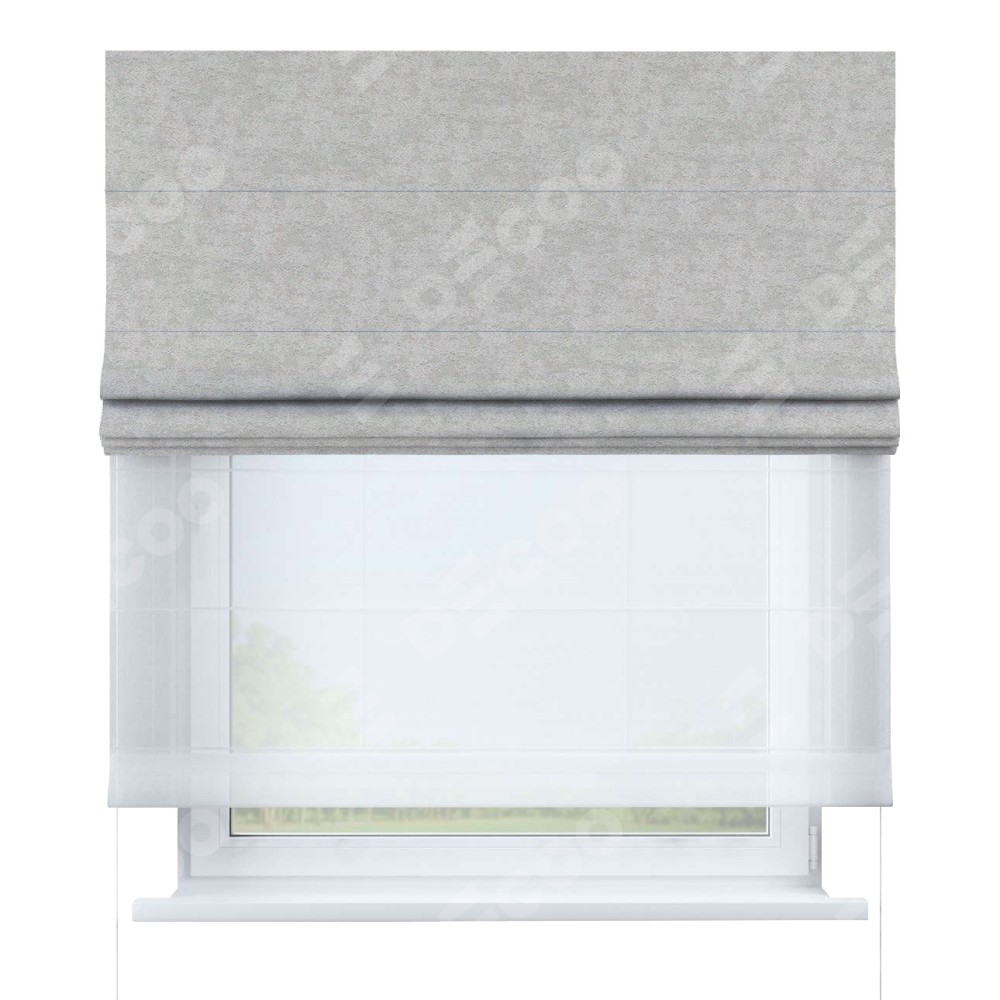 Двойная римская штора «День-ночь» от производителя Cortin предназначена для использования в проёмах. Эта штора уникальна тем, что состоит из двух полотен. На лицевой стороне находится софт мрамор светло-серый (артикул: 93582), обеспечивающий эффективное затемнение. В комплект также входит вторая ткань — легкий белый тюль (артикул: V-01), который добавляет изящества и легкости оформлению окна. Кроме того, доступны и другие разновидности ткани тюль, выбор которых доступен по  ссылке .