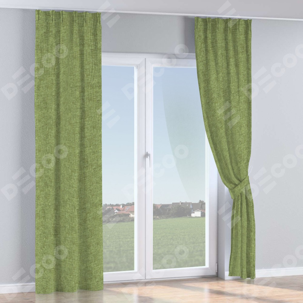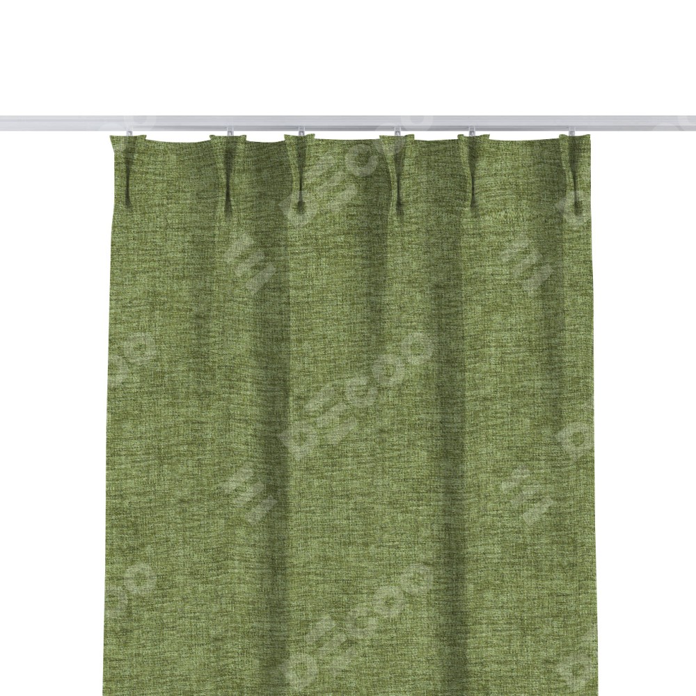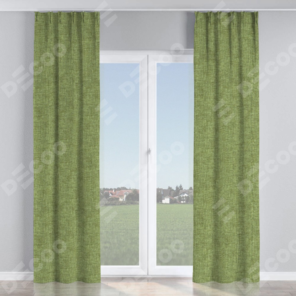 Комплект прямых штор, от производителя «Cortin», пошиты из ткани рогожка димаут травяной, артикул ткани 91021. С изнаночной стороны в верхней части штор пристрачивается шторная лента с декоративными складками «Кустик». Для создания элегантных складок прямые шторы шьются по стандарту с коэффициентом 1:2 (на 100 см. ширины проёма 200 см. ширины ткани).